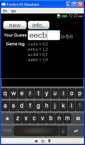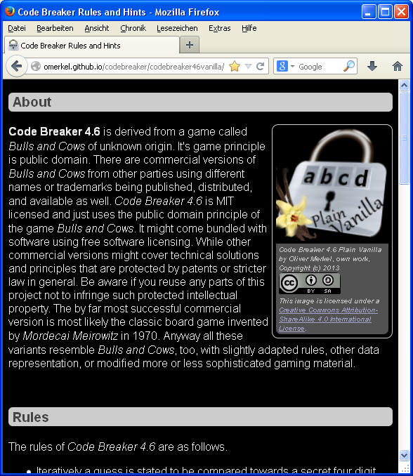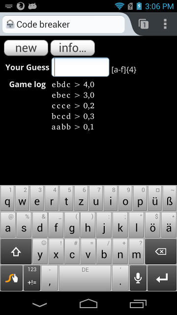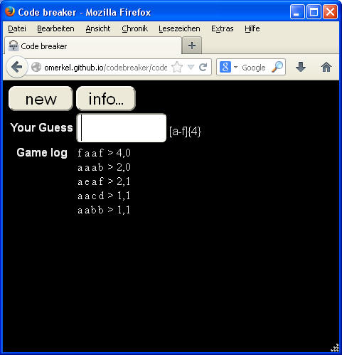 CodeBreaker 4.6 Plain Vanilla demonstrates a possible implementation result from a Code Breaker Kata (Coding Dojo). The user interface is still held in plain vanilla design (quite simple, less sophisticated). A similar type of application compared to this Codebreaker version is probably known as Bulls and Cows. Other trademarks and names for Codebreaker alike applications exist as well. The computer determines a hidden secret code. The user iteratively shall state a guess retrieving hints to get closer to the secret. The hints include the amount of exact matching digits in correct position and additionally the amount of digits included in the secret code but at non matching position. The numbering in the title of the application is actually not a version number. Numbering 4.6 shall indicate that the secret code and guesses contain four digits with six different values in range of representation by letters a to f. Using color representation is avoided on purpose for better support of color weakness or color blindness here. There is no maximum limitation of guesses. Feel free to get the existing alternative variants and correlated sources, fork the repository, enhance and adapt functionality as needed, enjoy, examine, and experiment with the application. Any feedback is highly appreciated and welcome. If you like the application then tell others about it. Otherwise you are invited to tell me about it ;-)