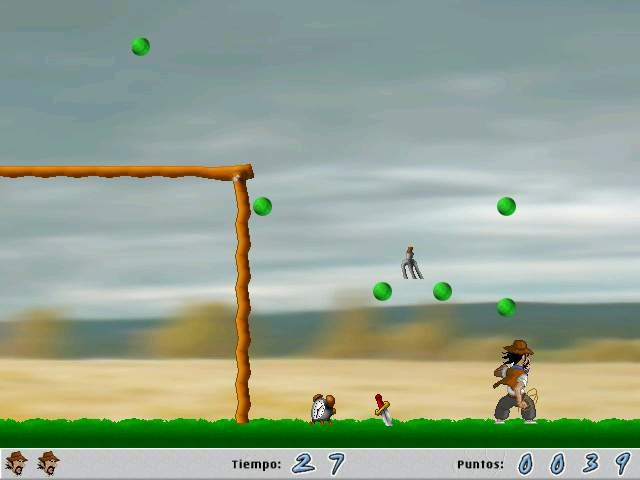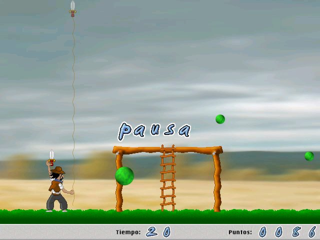 Ceferino, a game similar to 'Super Pang'. You are attacked by little green balls which are bouncing around and which you have to destroy with your knife. A game similar to 'Super Pang'. You are attacked by little green balls which are bouncing around and which you have to destroy with your knife. Your knife however is limited to being thrown upwards, thus you have to get under the balls to destroy them. Even worse, if you destroy a large ball, it doesn't just vanish, but breaks apart into two smaller balls. Levels consist of little platforms connected by ladders, so you can go up and down or find cover if needed.