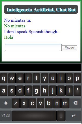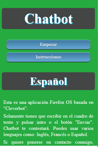 Chatbot is a chat to talk to "the machine". Chatbot conversation mimics a human by techniques of Artificial Intelligence. Talk to Chatbot and tell what you want. Chatbot is the friend that will always answer at any time. Chatbot is able to speak several languages​​: English, French, Spanish ... Chatbot requires that the device is connected to the internet to function.