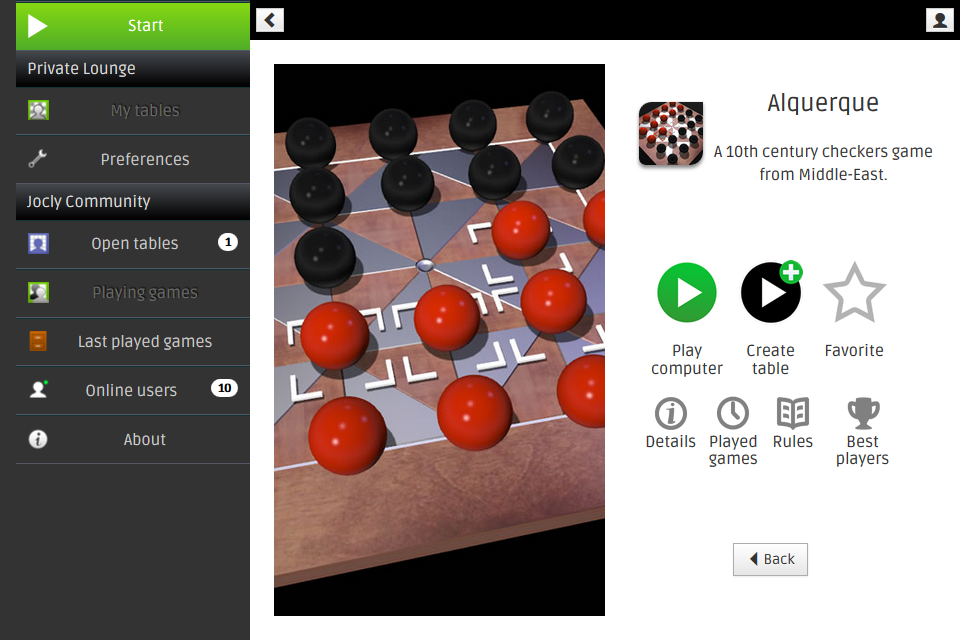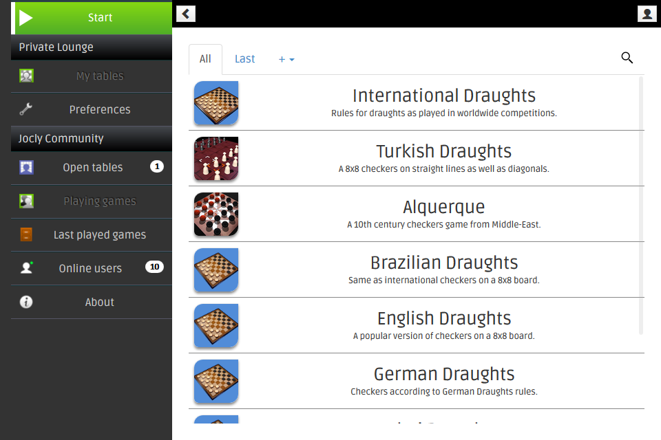 Checkers or Draughts is one of the oldest game in the world. It exists in many variants. Draughts (or Checkers) probably originated in Egypt as gaming boards were found in the Durna temple (1400 B.C.). The game Quirkat was then mentioned around 970 A.C. in an Arabic book. Following the invasion of Spain by the moors, it became Alquerque. Its rules were first written in the Libro de los juegos, commissioned by Alfonso X, king of Castille, Leon and Galicia (1221-1284). Playing Alquerque rules on a chess board appears in the south of France around 1100. The game is described under the name Fierges in 1243, and the rule allowing promotion is introduced. The game name then changes to Dames. There are many variants of draughts, where board size, promoted pieces move rules, compulsory capture and a few other rule details vary. This application implements 9 variants of checkers.