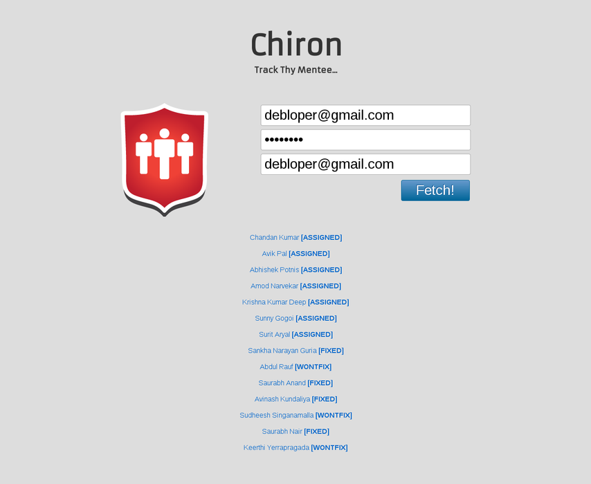 Chiron is a small utility to ease the bugzilla-search for Mozilla Reps' to track the mentees under any of the Mentors. Given a mentee, his Rep's profile does point to his Mentor - but given a Mentor, a reverse lookup of all his mentees was long but a missing feature... well, no more!