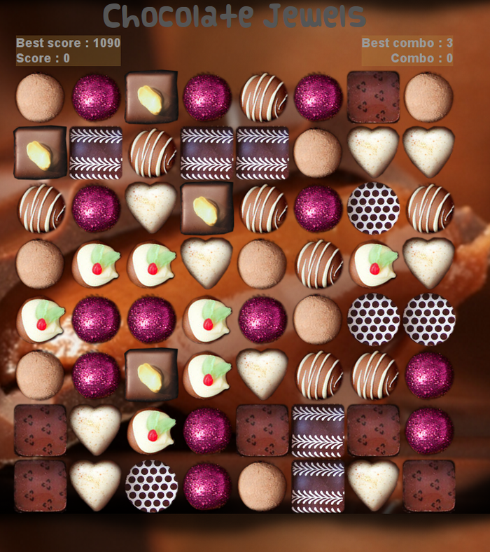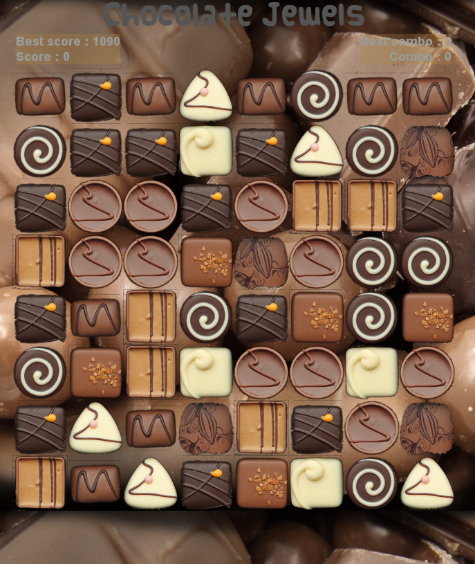 If you are here, you must love chocolate! Chocolate Jewels is a match 3 game like Candy Crush Saga or Jewels Star. Like any jewls game, Chocolate Jewels let you have hours of fun! Chocolate Jewels has several levels, and after each level you advance along a map representing a new candy tray. New jewes are added in each candy tray. In each level you have, sometimes, to fight against the time, but not all time. If there are only few jwels with valid moves, you will have only few seconds to find what position they are placed. If you move a wrong jwels the game wont let you go, and your time keeps decreasing. When you successful finish a level there are a little surprise and you can send this little surprise to your friends that will can play this little sweet and fun jewles game! Chocolate Jewels is a game for chocolate lovers, and chocolate lovers like chocolate Truffles! A chocolate truffle is a type of chocolate confectionery, traditionally made with a chocolate ganache centre coated in chocolate, icing sugar, cocoa powder or chopped toasted nuts (typically hazelnuts, almonds or coconut), usually in a spherical, conical, or curved shape. Other fillings may replace the ganache: cream, melted chocolate, caramel, nuts, almonds, berries, or other assorted sweet fruits, nougat, fudge, or toffee, mint, chocolate chips, marshmallow, and, popularly, liqueur. Their name derives from the usual shape they take as the word 'truffle' derives from the Latin word tuber, meaning "swelling" or "lump", which later became tufer. The chocolate truffle is thought to have been first created in France. There are now three main types of chocolate truffles: American, European, and Swiss: - The "American truffle" is a half-egg shaped chocolate-coated truffle, a mixture of dark or milk chocolates with butterfat and, in some cases, hardened coconut oil. Joseph Schmidt, a San Francisco chocolatier, and founder of Joseph Schmidt Confections, is credited with its creation in the mid-1980s. - The "European truffle" is made with syrup and a base made up of cocoa powder, milk powder, fats, and other such ingredients to create an oil-in-water type emulsion. - The "Swiss truffle" is made by combining melted chocolate into a boiling mixture of dairy cream and butter, which is poured into molds to set before sprinkling with cocoa powder. Like the French truffles, these have a very short shelf-life and must be consumed within a few days of making. In addition to these main types, the "raw" truffle is made by combining coconut oil, raw cacao and raw yacon syrup or raw agave, then rolling them in either raw, shredded coconut, raw cacao and/or chopped almonds. Sometimes, we used to call it chocolat, other, may be, चॉकलेट, chocolade, شوكولا, ciocolată, Schokolade, チョコレート, cioccolato, шоколад, çikolata, 초콜릿, or even, 巧克力. But, for real chocolate lovers, no matter the name, chocolate is just chocolate! Some chocolate flavours you will find inside Chocolate Jewels: - Traditional Chocolate Truffles - Caramel Chocolate Truffles - White Chocolate Truffles - Dark Chocolate Truffles - Milk Chocolate Truffles - Chocolate Orange/Jaffa/Grand Marnier Truffles - Chocolate Jaffa Truffles - Chocolate Grand Marnier Truffles - Chocolate Hazelnut Truffles - Chocolate Brandy Truffles - Chocolate Chilli Truffles - Chocolate Mint Truffles - Chocolate Fig Truffles - Chocolate Almond Truffles - Coffee chocolate truffles - Chocolate Ginger Truffles - Coconut Truffles - Chocolate Fruit Truffles - Chocolate Nut Truffles - Chocolate Pistachio Truffles - Chocolate Cherry Truffles Enjoy!