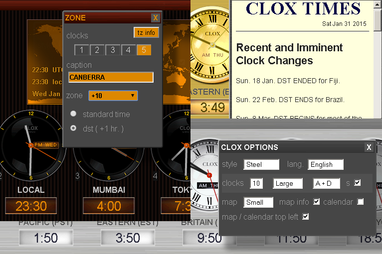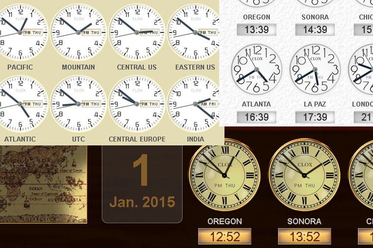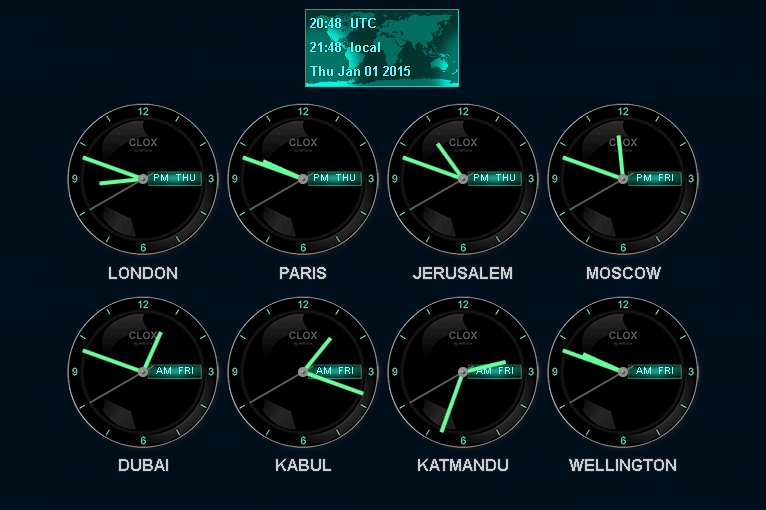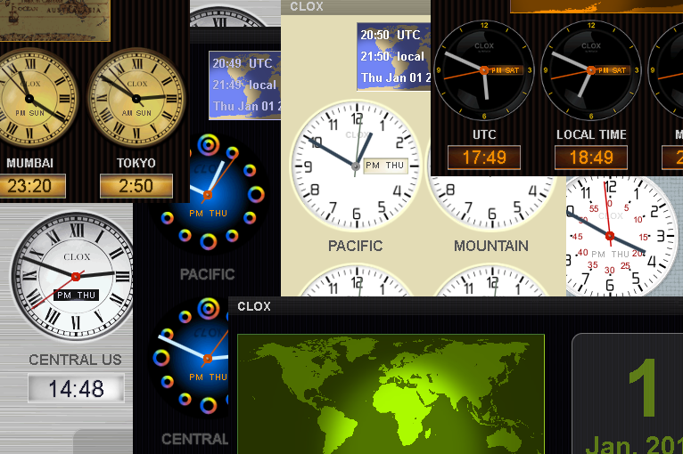 CLOX 8 is an easy to use app that provides clocks showing the time in user-selected timezones. Any number between one and ten analog and/or digital timezone clocks can be shown and built-in skins let you customize the app to your taste. The language and the size of the clocks, and other elements can also be changed. Local time and UTC (GMT) can be displayed in addition to ten other selected time zones. A world daylight map and a calendar can also be displayed. Built-in live news features and a searchable time zone reference helps keep users updated about changes to time zones and daylight saving arrangements around the world. CLOX 8 is so simple and intuitive to use you might never need to read the user guide provided but detailed explanations are included just in case. Email support is free. If you have family, friends or business associates in other timezones CLOX is an invaluable and delightful tool for knowing exactly what time it is where they are. With CLOX you will have all the time in the world!