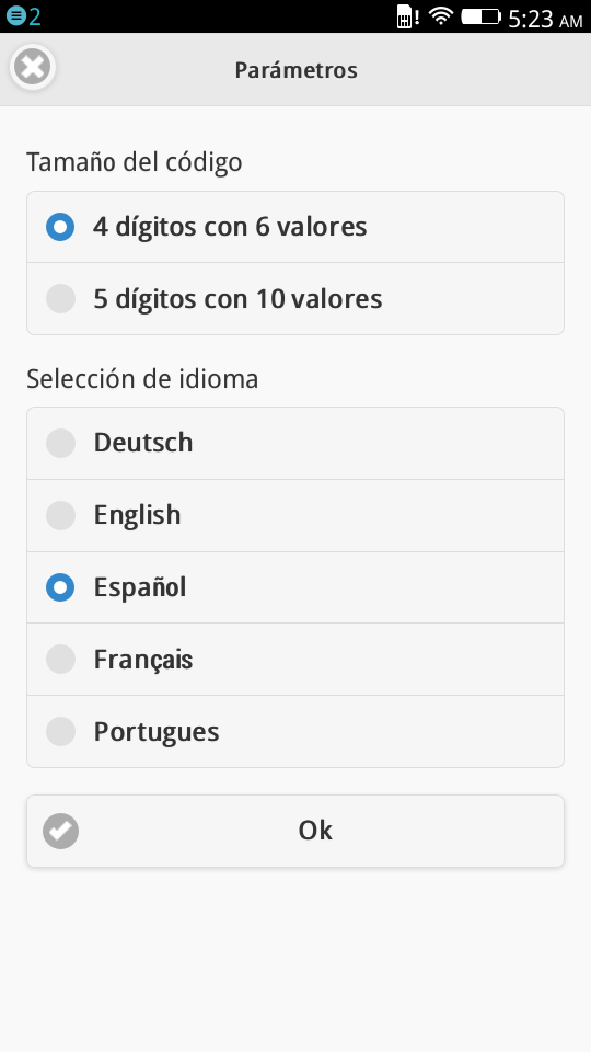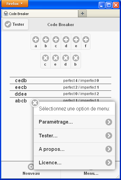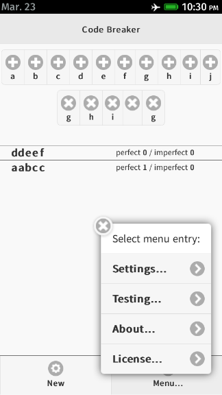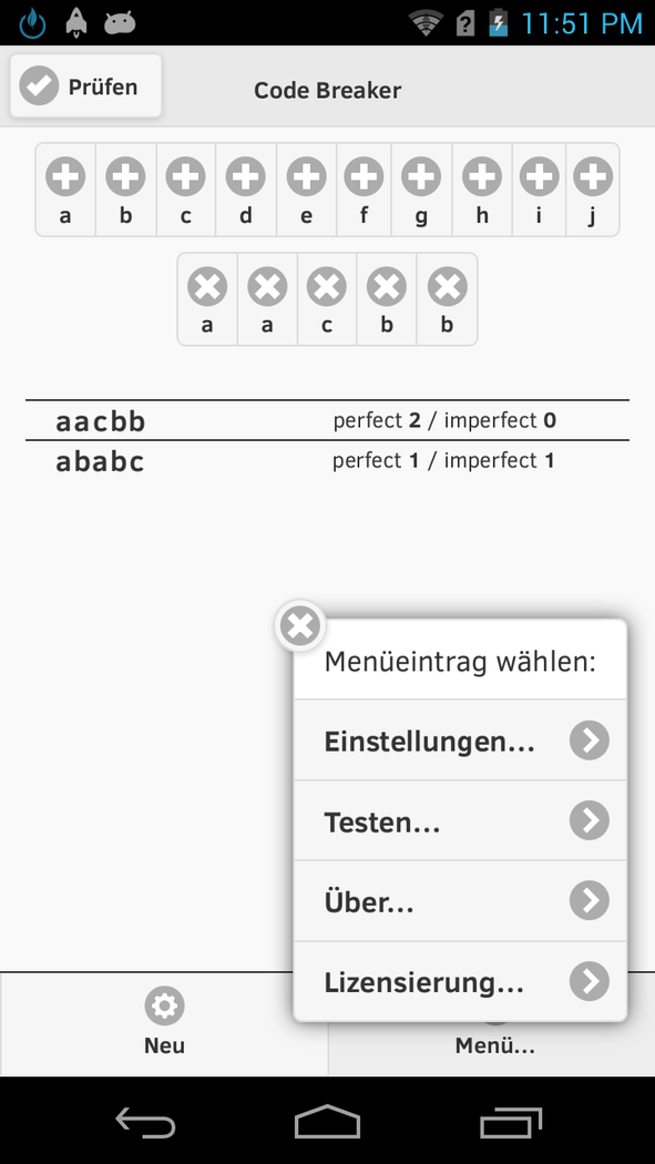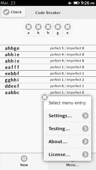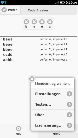 The computer determines a hidden secret code. The user iteratively shall state a guess retrieving hints to get closer to the secret. The hints include the amount of exact matching digits in correct position and additionally the amount of digits included in the secret code but at non matching position.- Support of different codesizes and amount of values per digit.