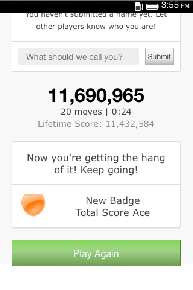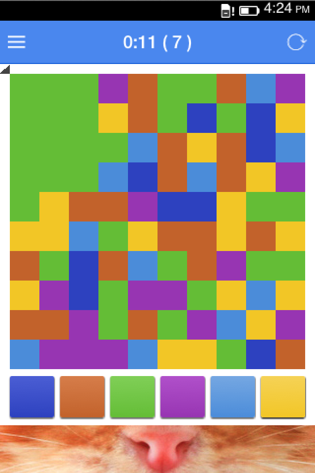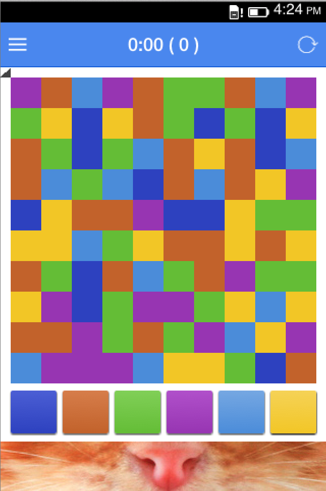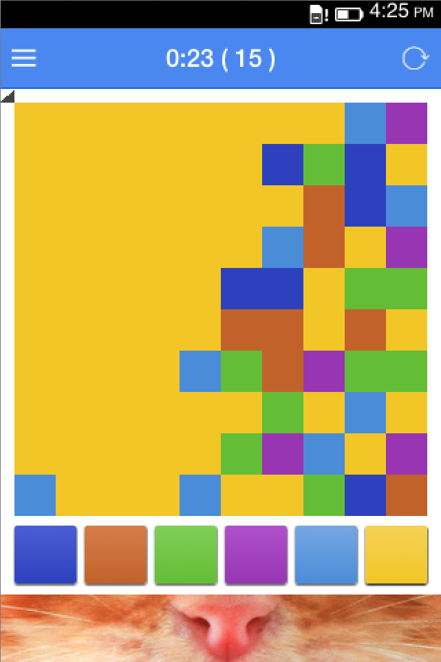 Color Puzzle is proud to finally launch on Firefox OS! Over 50,000 players have spent over 10,000 hours playing this addictive and easy puzzle game. The goal is simple, hit the buttons on the bottom of the screen to change the color of the top left block. Use that to flood the board with the same color as fast as you can, and in the least number of moves. Every game you play adds your score to a global competition and ranking. Just play a few more games to beat the next person in the ranking. Earn badges and improve your rank, all while having a zen-like experience making all the colors match. Soon, you'll find yourself wanting to play... just one more game.