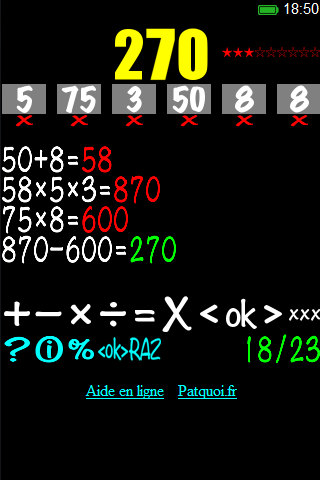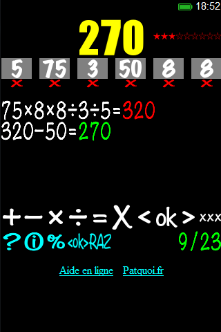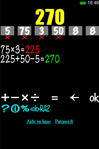 Le compte est bon ! Essayez de trouver le compte avec les six nombres donnés et les quatre opérateurs +, -, × et ÷ en utilisant une seule fois chaque nombre et chaque résultat calculé. Grâce à Comptissibon, vous pouvez évaluer votre « tendance » à la complexité en choisissant l'option de recherche de toutes les solutions distinctes. Le compte est bon ! Essayez de trouver le compte avec les six nombres donnés et les quatre opérateurs +, -, × et ÷ en utilisant une seule fois chaque nombre et chaque résultat calculé. Avec Comptissibon : - Vous n'avez pas de restriction de temps : votre objectif est de trouver le compte. - Vous pouvez utiliser plus de 2 nombres par ligne d'opération (mais + et - ne se mélangent pas avec × et ÷). - Toucher « = » permet d'afficher automatiquement le résultat d'une ligne d'opération. - Vous pouvez toujours changer d'opérateur ou de nombre sans avoir besoin d'effacer le précédent. - Toucher « ← » permet d'effacer toute la ligne en cours. La deuxième fois efface tout le calcul. - Le calcul en cours est sauvegardé automatiquement si vous quittez l'application ou éteignez votre appareil. Une fois le calcul saisi, vous pouvez voir une des meilleures solutions (par défaut). Cependant, vous avez une option pour voir toutes les solutions distinctes et, si vous avez trouvé le meilleur résultat, voir le rang de votre proposition parmi la liste des solutions classées par ordre de la plus simple à la plus complexe. Attention, cette recherche peut prendre plus d'une minute selon le compte et la puissance de votre appareil. Des statistiques permettent de vous donner un aperçu de votre performance, notamment votre « tendance » à la complexité grâce à la recherche de toutes les solutions distinctes. Bons comptes !