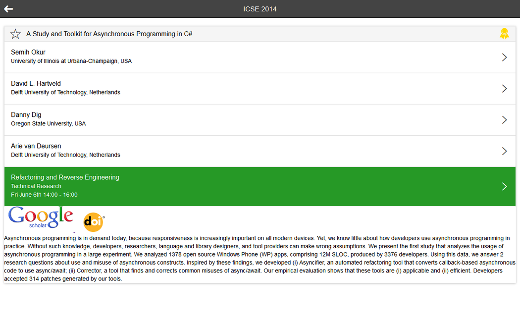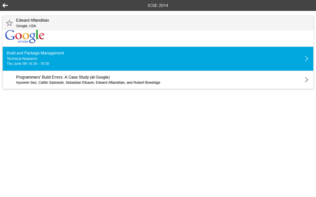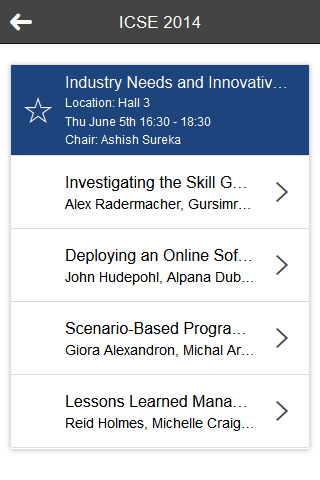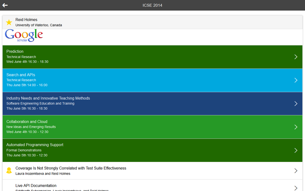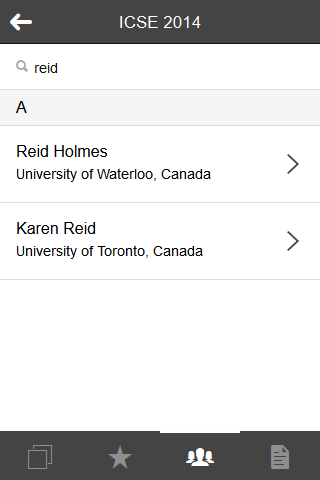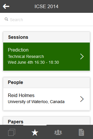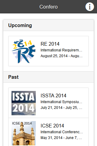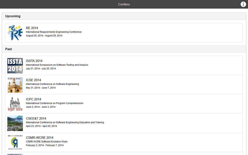 Confero provides a customizable conference program to various academic conferences. Users are able to select the papers and sessions that they find most relevant to include in their own custom program. Confero is intended to help conference attendees more easily plan their day so they can spend more time networking with peers and going to great talks and less time flipping through the conference program.