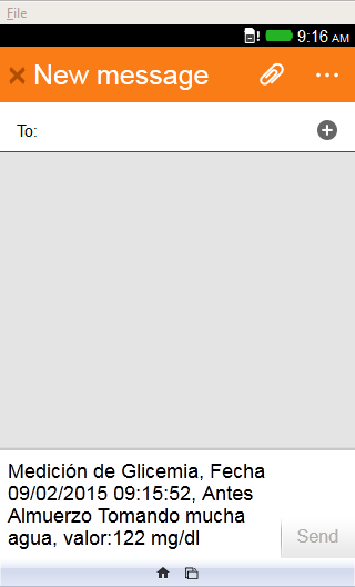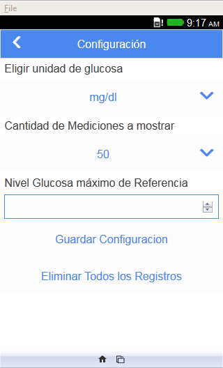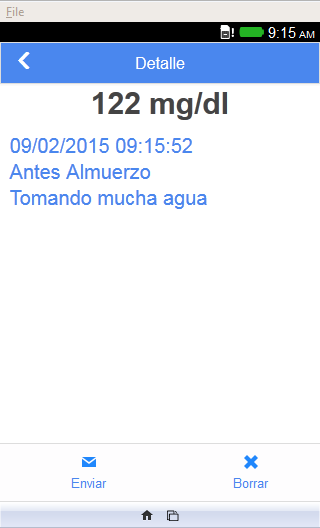 Aplicación para llevar los registros de tu medición de Glicemia, permite configurar la unidad de medida, valor de referencia y enviar tus resultados por SMS o por Correo electrónico.