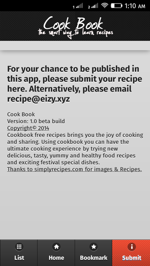 Get a new recipe everyday. For your chance to be published in this app, please submit your recipe, email: [email protected] Cookbook free recipes brings you the joy of cooking and sharing. Using cookbook you can have the ultimate cooking experience by trying new delicious, tasty, yummy and healthy food recipes and exciting festival special dishes.