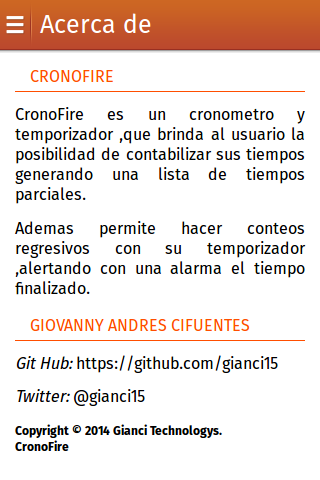 CronoFire es un cronometro y temporizador con diseƱo agradable y eventos tactiles ,que brinda al usuario la posibilidad de contabilizar sus tiempos generando una lista de tiempos parciales.Ademas permite hacer conteos regresivos con su temporizador ,alertando con una alarma el tiempo finalizado.
