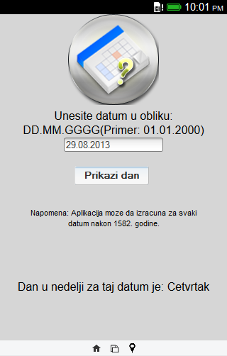 Uz pomoć ove aplikacije možete odrediti dan u nedelji za bilo koji datum nakon 1582. godine.