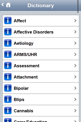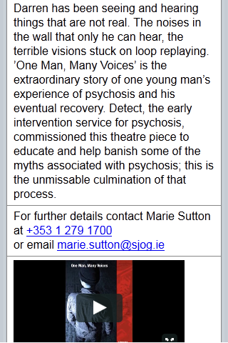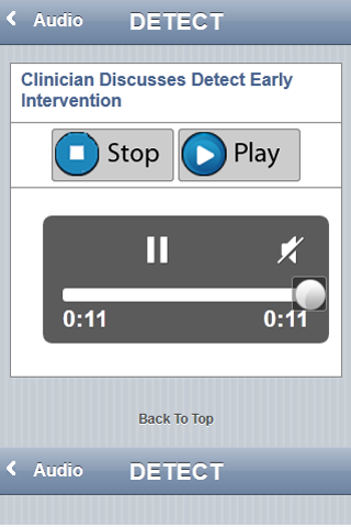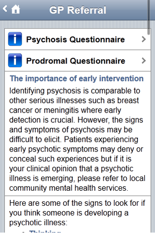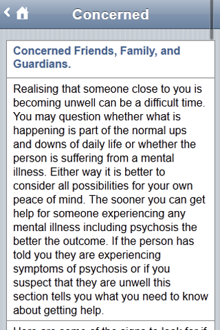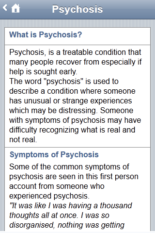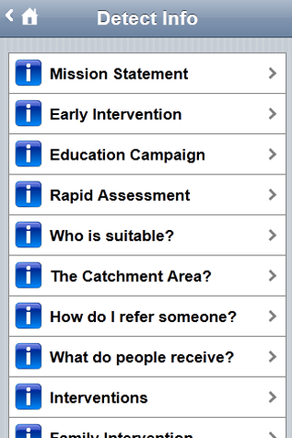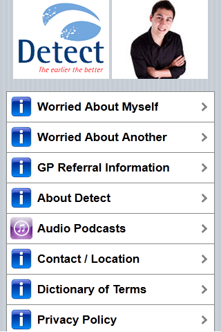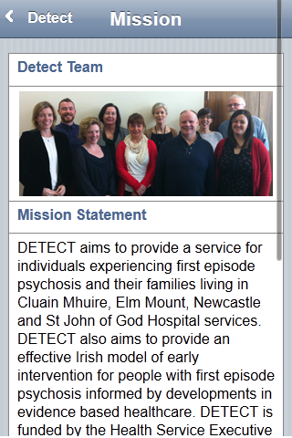 The Detect App gives you information about early intervention for psychosis. Detect is an early intervention service in Dublin and North Wicklow (Ireland). The Detect App is useful for people interested in this topic, particularly people who have experienced psychosis, their families and friends and health care professionals (GP etc.). The Detect App is divided into three user friendly sections (1) someone concerned about themselves; (2) someone concerned about someone they know; (3) health professionals. Each section provides information in accessible language to give a clear understanding about psychosis, the importance of getting help early and the treatment available. In addition to written descriptions there is also audio interviews with someone with experience of psychosis and a DETECT clinician. Within the section for health professionals are two questionnaires to assist clinicians when they are undertaking an assessment with a person they suspect might be experiencing psychosis. The DETECT App is part of a multi media education campaign to increase public and professional knowledge about psychosis. The major activities undertaken over the last five years are described within a dedicated section of the App. If you or a loved one has interest in mental health or mental illness this App would be helpful. If you are interested in any of the following this App would be helpful : psychosis , schizophrenia , depression , bipolar , personality disorder , anxiety , self harm , suicide , mood , abuse , eating disorder , paranoia , delusions , halucinations , symptoms , medication , suffering , recovery , treatment , madness , healing , wellbeing , crazy
