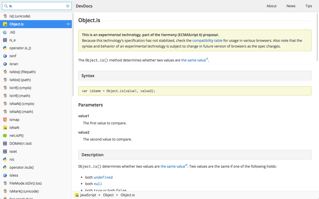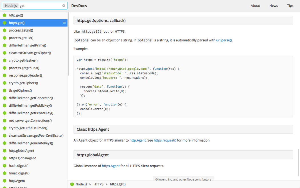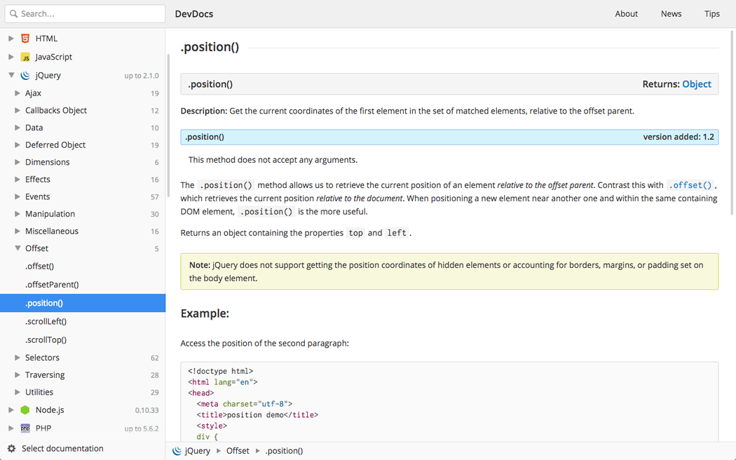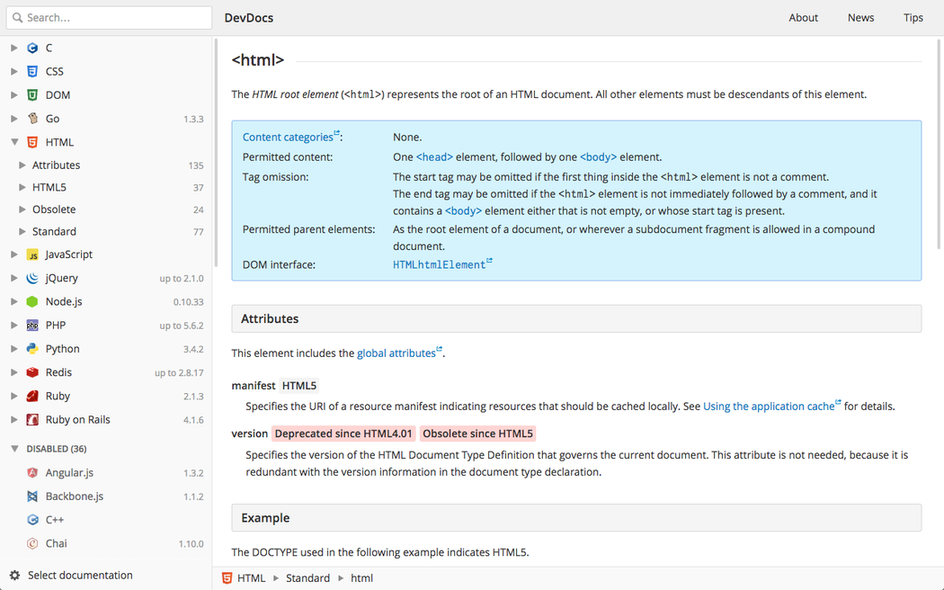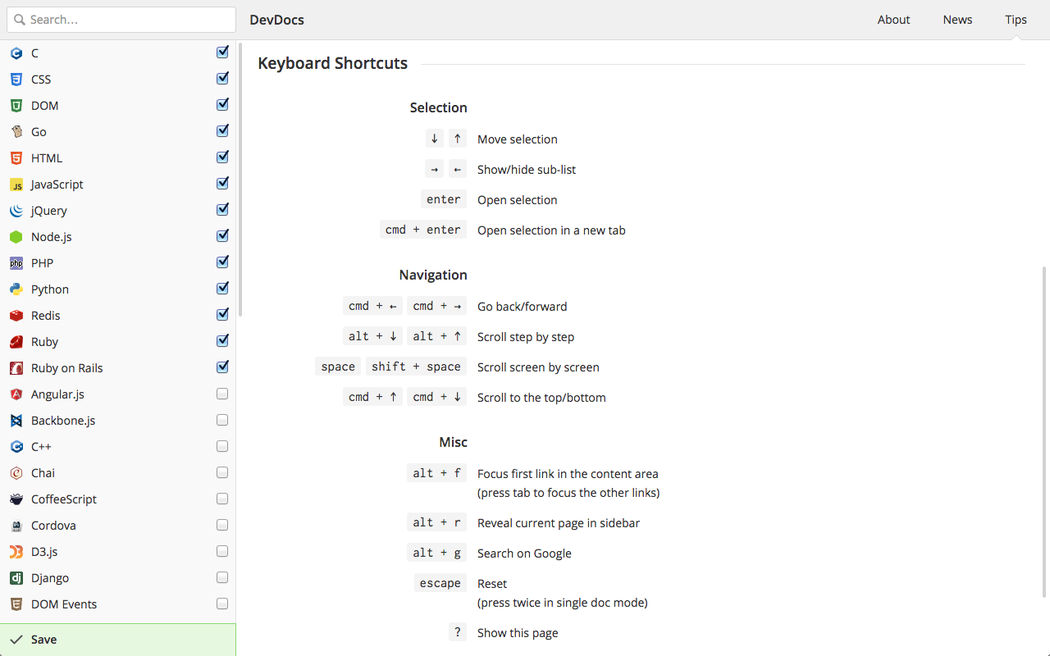 All-in-one, offline API documentation browser with a fast, organized, and searchable interface. DevDocs provides a convenient interface for reading and searching multiple reference documentations. * Fully-functional offline * Fast, fuzzy search * Toggle docs on/off * Keyboard shortcuts * Retina support * Mobile version * Dark theme * Free and open source Supported documentations: - Angular.js - Apache - Backbone.js - Bower - C - C++ - Chai - Clojure - CoffeeScript - Cordova / Phonegap - CSS - D3.js - Django - DOM - Ember.js - Express - Git - Go - Grunt - Haskell - HTML - HTTP headers and status codes - io.js - JavaScript - jQuery - jQuery Mobile - jQuery UI - Knockout.js - Laravel - Less - lo-dash - Lua - Marionette.js - Markdown - Meteor - Minitest - mocha - Modernizr - Moment.js - Mongoose - Node.js - Nokogiri - nginx - npm - PHP - PHPUnit - PostgreSQL - Python - React - Redis - RequireJS - RethinkDB - Ruby - Ruby on Rails - Rust - Sass - Sinon - Socket.IO - SVG - Symfony - Underscore.js - XPath - Yii https://github.com/Thibaut/devdocs