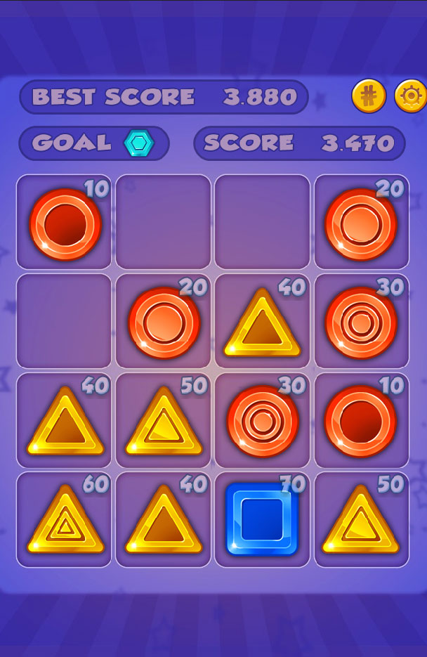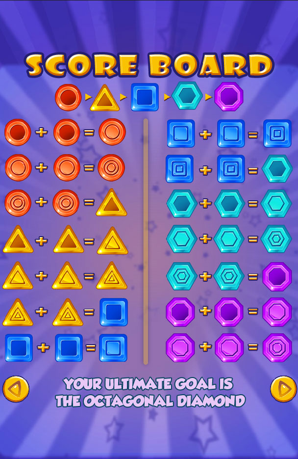 Amazing, fun and addictive puzzle game. Swipe up, down, left or right to merge gems. Merge 2 gems to transform to a new gem with more layers and/or angles. Your ultimate goal is the octagonal Diamond.