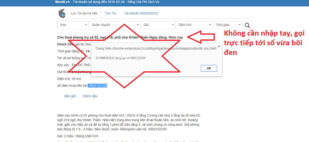 Tiện ích chuyển dữ liệu từ web sang điện thoại để thực hiện kiểm tra và gọi Cơ hội duy nhất để MIỄN PHÍ trải nghiệm MOOM.VN ngay HÔM NAY Sử dụng dịch vụ của chúng tôi, bạn được gì ? ✔ Gọi điện cho môi giới hay chính chủ tức thì mà không cần nhập tay ✔ Chỉ cung cấp thông tin bất động sản CHÍNH CHỦ cho một số nhất định các nhà môi giới bất động sản chuyên nghiệp ✔ Cập nhật thông tin liên tục. Chỉ với 5 phút mỗi ngày, bạn sẽ có ngay những thông tin chính chủ mới nhất. ✔ Thu thập dữ liệu từ nhiều nguồn khác nhau. ✔ Loại bỏ các tin không chính chủ. Thông tin liên hệ : ★ Điện thoại: (04) 35 589 589 ★ Email: moom.vn@outlook.com Trụ sở chính tại Hà Nội: Số 8, ngách 19/9, Phố Kim Đồng, P.Giáp Bát, Q.Hoàng Mai, Tp Hà Nội. Văn phòng giao dịch: Tầng 4B tòa nhà T608 ngõ 643A Phạm Văn Đồng, P. Cổ Nhuế 1, Q. Bắc Từ Liêm, TP Hà Nội. Hotline 24/24: 0904.436.266 - 0989.654.990 ★ Fanpage: https://www.facebook.com/hotrotimnhacooc.vn/