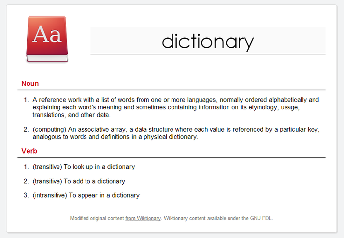 A Simple but Powerful Dictionary. An easy-to-use dictionary that gets instant definitions from the ever-expanding Wiktionary database. Future updates: language support synonyms translations