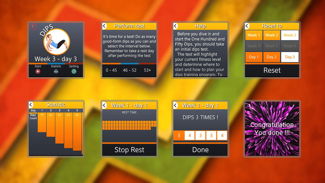 Dips offers you a unique opportunity to get into shape, learn how to do 150 dips as well as to shape a beautiful muscle profile in only six weeks. Forget complicated systems and exhausting, hours-long workouts! All you need now is 10 minutes three times a week, a comfortable spot, and your smartphone. Dips has a very simple interface with convenient, customizable functionality. Workouts, reminders, statistics – everything is just two clicks away. Nothing will distract you from the workout now! Simple functionality to reach complicated goals: • Level selection, depending on the results of a physical fitness test • Regular adjustments of workout intensity to your level • Detailed statistics of exercises performed • Interface that does not distract you from you main goal
