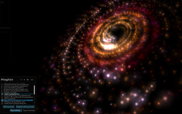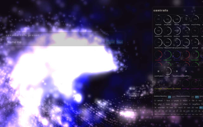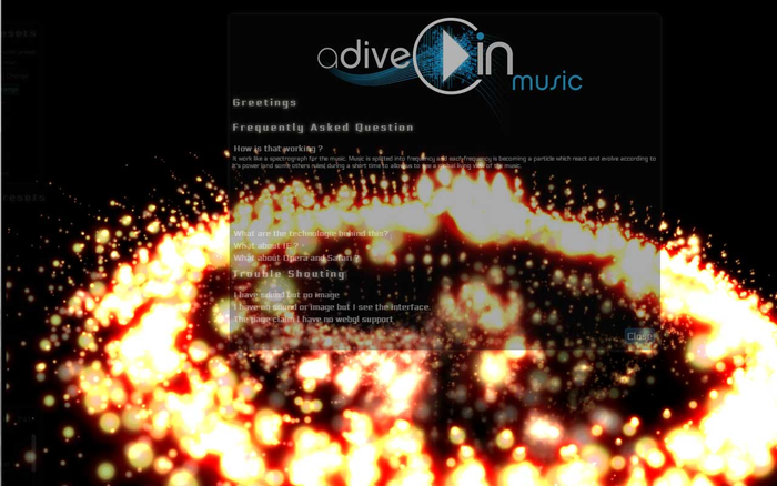 'Do a dive in music' let you play and admire your music into a 3D real time sound visualization (web-GL). You can also elaborate and share your own awesome visualizations and discover some common creative musics. This application let you play your own music and visualize it into a 3D realtime interactive world. You can create your own presets, save and/or share them. It work like a spectrograph for the music. Music is splitted into frequency and each frequency is becoming a particle which react and evolve according to it's power (and some others rules) during a short time to allow you to see a global living view of the music. So you can literally view your music. You don't believe it ? see that video