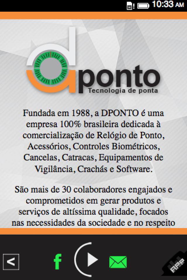 Fundada em 1988, a DPONTO é uma empresa 100% brasileira dedicada à comercialização de Relógio de Ponto, Acessórios, Controles Biométricos, Cancelas, Catracas, Equipamentos de Vigilância, Crachás e Software. São mais de 30 colaboradores engajados e comprometidos em gerar produtos e serviços de altíssima qualidade, focados nas necessidades da sociedade e no respeito ao meio ambiente. Como prova a sua história, a DPONTO acredita que todo o seu crescimento é uma consequência do aperfeiçoamento contínuo da qualidade dos seus produtos e do relacionamento com seus fornecedores e clientes, fundamentado na ética, na idoneidade e no cumprimento dos compromissos assumidos. O nosso fundador e hoje presidente da DPONTO o Sr. DEREK, começou a trabalhar muito cedo com o seu pai, num pequeno comércio no bairro da Enseada, Guarujá em São Paulo. Daí para frente, DPONTO entrou em franca ascensão. Em 1994 a DPONTO visualizou nova oportunidade e aumentou a variedade de produtos que fornecida aos seus clientes. Foi neste ano também que a DPONTO expandiu suas atividades para a área de serviços, segura da sinergia inerente e coerente com os novos desafios estratégicos.
