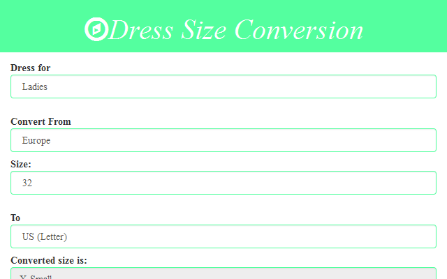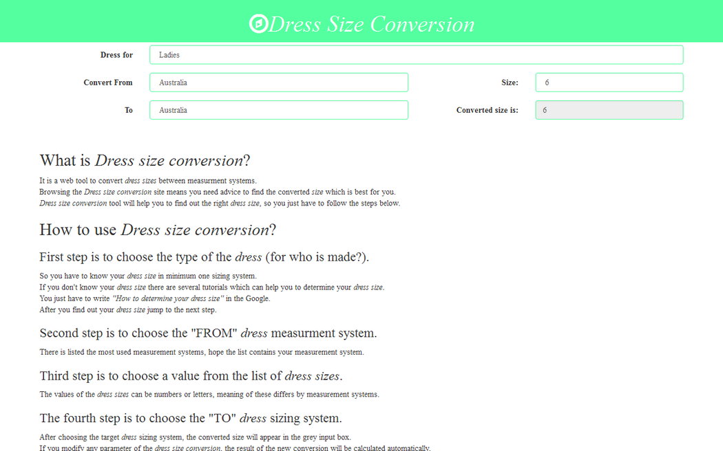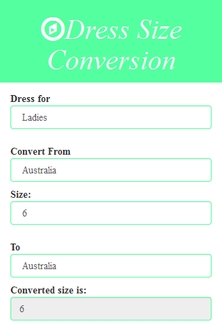 Dress Size Conversion is a web tool to convert dress sizes between different sizing systems. It is very user friendly, just modify the converter's parameters and the conversion is executed instantly