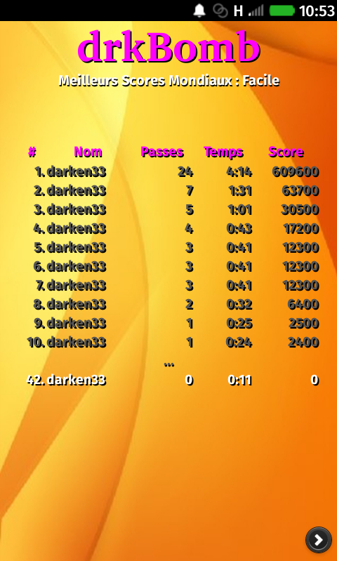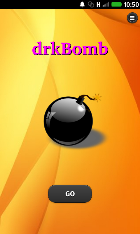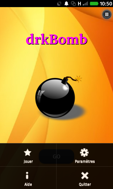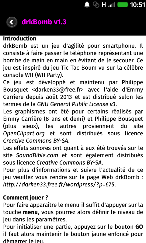 drkBomb - The game "Give the bomb to your friends !!!" as Free Software. Introduction drkBomb is an agility game for smartphone. It involves passing the phone represents a bomb from hand to hand by avoiding shaking. This game is inspired by the game Tic Tac Boum seen on the famous console WII (WII Party). This game is developed and maintained by Philippe Bousquet with the help of Emmy Carrière since August 2013 and is distributed under the terms of the GNU General Public License v3. Some graphics have been made by Emmy Carrière (8,5 yeras old) and Philippe Bousquet (oldest), the other from the site OpenClipart.org and are distributed under Creative Commons BY-SA license. The sound effects have been found on the site SoundBible.com and are also distributed under Creative Commons BY-SA license. For more information and follow the news of this game please visit the drkBomb Web page: http://darken33.free.fr/wordpress/?p=739. You can also download the source code as a free software. How to play? To bring up the menu simply press the menu button, then you can define the level of play in the settings. To initialize a game, press the GO button, then hold down the yellow button to start the game. After 10 seconds, the other button is flashing, then release the first button and within 2 seconds press the second button. If this action is not made within 4 seconds, the bomb explodes. Then repeat the operation. Warning, do not shake the phone, press or release too early or too late a button, otherwise the bomb explodes and the game is over. Good luck