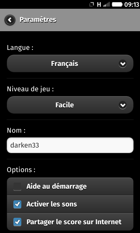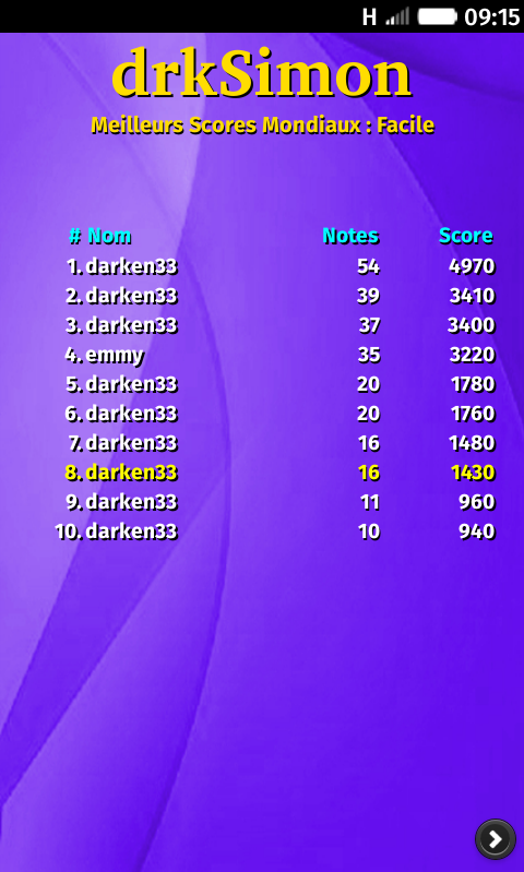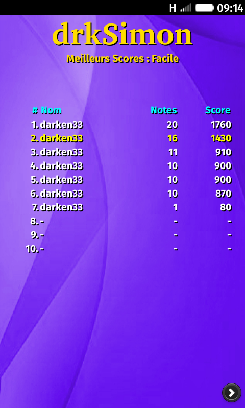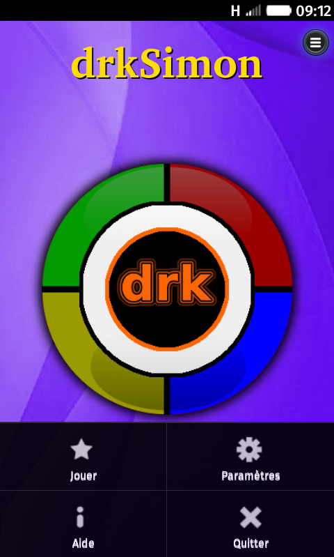 drkSimon - The famous electronic game of th 80's simon as Free Software. Introduction drkSimon is a memory game for smartphones. It uses the principle of the famous 80's arcade game Simon. This game is developed and maintained by Philippe Bousquet <[email protected]> since October 2013 and is distributed under the terms of the GNU General Public License v3. The graphics were designed by Philippe Bousquet and distributed under license Creative Commons BY-SA. The sound effects have been made through free software, such as Jackd, Qsynth et Audacity, and are also distributed under license Creative Commons BY-SA. For more information and follow the news of this game please visit the drkSimon's web page : http://darken33.free.fr/wordpress/?p=762. You can also download the source code of this application as a free software. How to play? To bring up the menu simply press the menu button, then you can define the level of play in the settings. To start a game, press the Simon, you must repeat the color sequence proposed by the game.As long as you do not make an error, a color is added to the sequence. How long will you take before you make a mistake ? Good luck