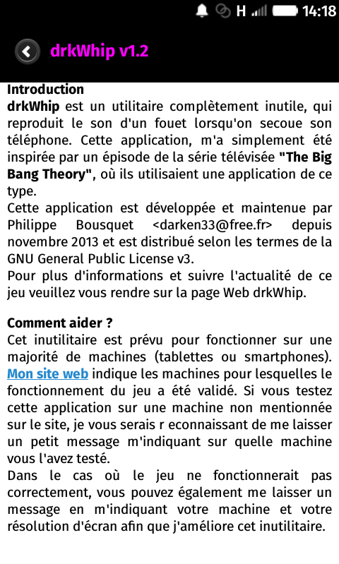 drkWhip - Un fouet dans votre mobile !!! (inspiré de la série The Big Bang Theory) drkWhip est un utilitaire complètement inutile, qui reproduit le son d'un fouet lorsqu'on secoue son téléphone. Cette application, m'a simplement été inspirée par un épisode de la série télévisée "The Big Bang Theory", où ils utilisaient une application de ce type. Cette application est développée et maintenue par Philippe Bousquet <[email protected]> depuis novembre 2013 et est distribué selon les termes de la GNU General Public License v3. Pour plus d'informations et suivre l'actualité de ce jeu veuillez vous rendre sur la page Web drkWhip : http://darken33.free.fr/wordpress/?p=792.