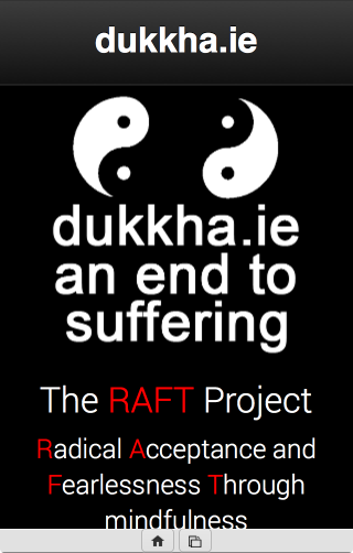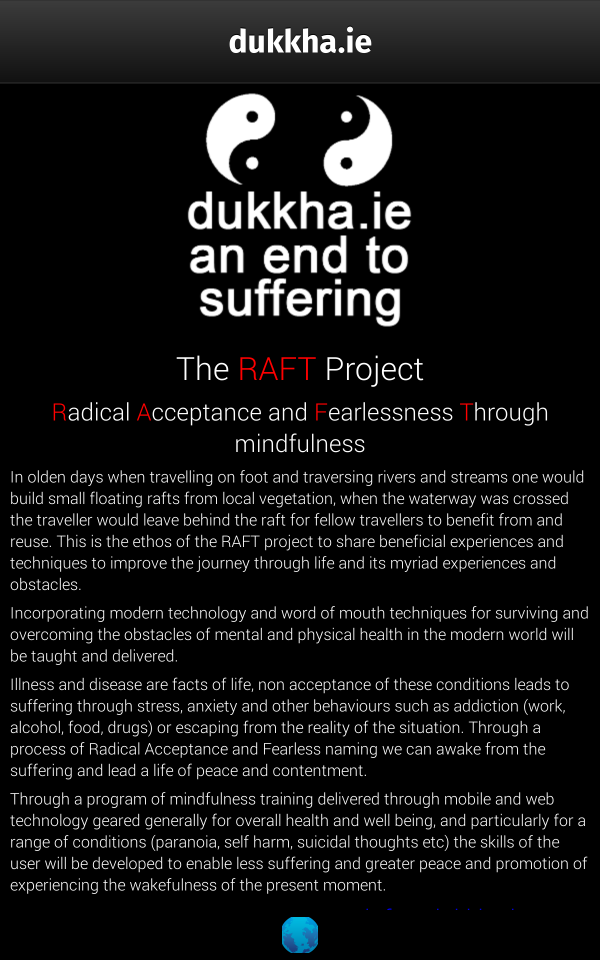 dukkha.ie a new philosophy to heal the world, an end to suffering The RAFT Project Radical Acceptance and Fearlessness Through mindfulness In olden days when travelling on foot and traversing rivers and streams one would build small floating rafts from local vegetation, when the waterway was crossed the traveller would leave behind the raft for fellow travellers to benefit from and reuse. This is the ethos of the RAFT project to share beneficial experiences and techniques to improve the journey through life and its myriad experiences and obstacles. Incorporating modern technology and word of mouth techniques for surviving and overcoming the obstacles of mental and physical health in the modern world will be taught and delivered. Illness and disease are facts of life, non acceptance of these conditions leads to suffering through stress, anxiety and other behaviours such as addiction (work, alcohol, food, drugs) or escaping from the reality of the situation. Through a process of Radical Acceptance and Fearless naming we can awake from the suffering and lead a life of peace and contentment. Through a program of mindfulness training delivered through mobile and web technology geared generally for overall health and well being, and particularly for a range of conditions (paranoia, self harm, suicidal thoughts etc) the skills of the user will be developed to enable less suffering and greater peace and promotion of experiencing the wakefulness of the present moment. This project will develop over time and updates will be delivered here.