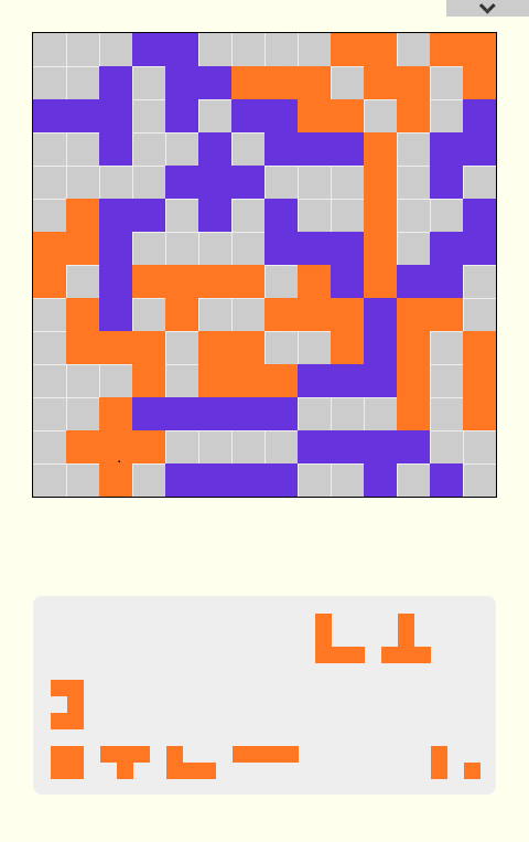Place the maximum number of pieces on the board, without getting blocked! Duokus is an implementation of the popular 2-players board game Blokus Duo. You can play against the computer in three levels of difficulty. Players take turns placing pieces on the 14x14 board. The first piece must cover the starting point. Each new piece must touch at least one piece of the same color on the corners of any square. No two sides of the same color can touch. Different colors can touch in any way. The game ends when both players are blocked from placing any more pieces.