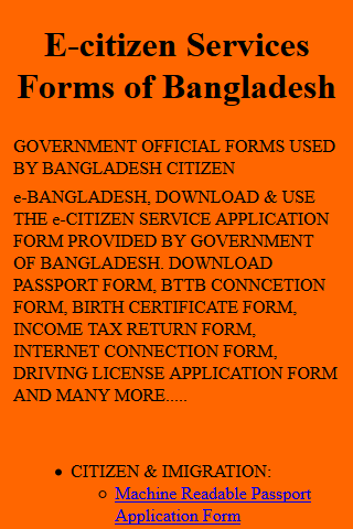 GOVERNMENT OFFICIAL FORMS USED BY BANGLADESH CITIZEN. e-BANGLADESH, DOWNLOAD & USE THE e-CITIZEN SERVICE APPLICATION FORM PROVIDED BY GOVERNMENT OF BANGLADESH. DOWNLOAD PASSPORT FORM, BTTB CONNCETION FORM, BIRTH CERTIFICATE FORM, INCOME TAX RETURN FORM, INTERNET CONNECTION FORM, DRIVING LICENSE APPLICATION FORM AND MANY MORE.....
