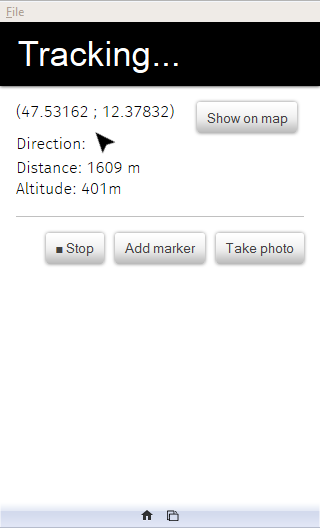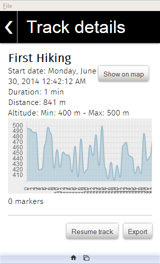 Simple Geo Movement recording and displaying application. With this application in your Firefox Phone you can record and share your tarvel/hiking/biking details with your friends. You can map your path and add relevant details to them. You can - Track and Record your path with a very detailed precision in a map - You can monitor your live progress in a real-time map - You can record and save your progress with track details - You can add markers in iun place you want with relevant description - You can add pictures to your track which will be displayed later with your saved markers on the map you recorded - Supports exporting your saved map with markers as a gpx file which you can later load in any mapping application or share with your friends Map application for outdoor enthusiasts that lets you: Track your movements and collect statistics about your hike Export your track in GPX format Import routes from GPX files