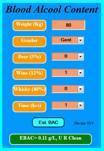 Estimated Blood Alchool Content This app calculates the Estimated Blood Alcohol Content (EBAC) known your weight, and what you have drunk. Here I made use of the well established Widmark formula in the expression presented in [Ki-05]. For simplicity of use, the beverages are divided in 3 major groups: light drinks (LD, beer and similar, about 5% vol content of alcohol), regular drinks (RD, wine, 12%) and heavy drinks (HD, whisky and friends, about 40%). For each kind, a standard quantity for each take is defined: 250ml for LD, 125ml for RD and 30ml for HD. In all cases, this corresponds to an alcohol intake of approximately 10g per unit. The user is required to provide his/her weight (in Kg), gender , the number of 'takes' per each beverage type and the average time since the drinks were taken (in hours). The app calculates the EBAC and provides a comment in different colors. Below 0.5 g/L it is OK (in a majority of european countries but mind: NOT everywhere), whereas between 0.5 and 0.8 g/L it reminds you that driving is forbidden (in many countries, see Ref.[wiki-1]). Between 0.8 and 1.5 g/L it driving can be a criminal offense (and, at any rate, driving at these EBAC levels is forbidden even in the more tolerant states), between 1.5 and 2.4 g/L the level is dangerous for health and above 2.4 g/L the liver capability of processing blood alcohol is surpassed and the health risk is really severe. It is worth to stress here that this code possess inevitable simplifications and approximations. It should thus be considered ad a rough indicator and in no case constitutes a substitute for the ethylometer. And, at the end, remember that no drinking at all is the best choice for the driver. References [Ki-05] K. KYPRI, J. LANGLEY and S. STEPHENSON, Alcohol & Alcoholism Vol. 40, No. 5, pp. 447–452, 2005 doi:10.1093/alcalc/agh178 [wiki-1] http://en.wikipedia.org/wiki/Drunk_driving_law_by_country
