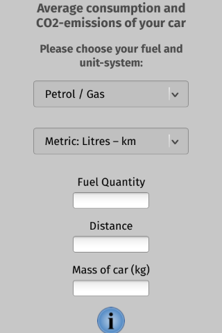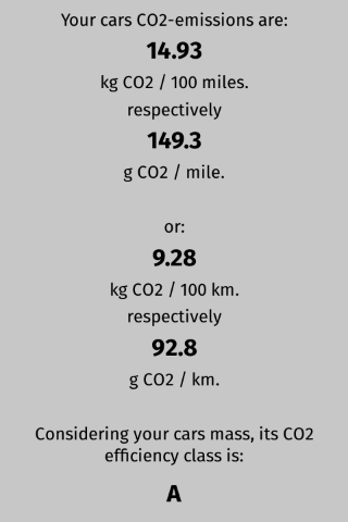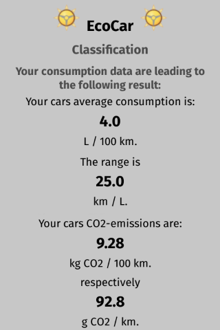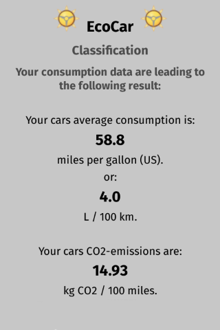 The EcoCar Fuel-Calculator calculates the average fuel consumption (Gasoline – Petrol, Diesel, LPG) of your car (in litres per 100 kilometres, miles per US-gallon and miles per imperial (UK) gallon). At the same time the CO2-emissions and the CO2 efficiency-class are determined. – Tested with Firefox OS 1.3 simulator, Firefox OS 2.2 simulator and Firefox OS 1.3 on ZTE OpenC. – No internet connection required. – Languages: English, German, French
