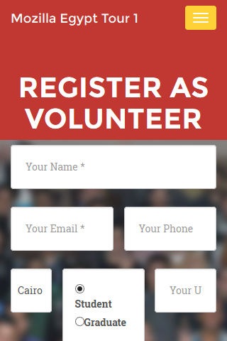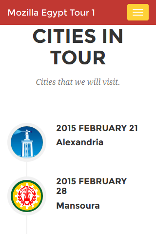 Mozilla Egypt Tour 2015 Join the open web community. Be part of one of the largest internet/web communities in the global. Join us .. as a representative, a student ambassador, or just volunteer as you can in the community: http://is.gd/ybuMgF Either a student or a developer, come and join the first Mozilla Tour in Egypt, where you will be introduced to the latest updates and technologies of Mozilla. Wherever you are, we will come to your city to help and guide you with what you need to learn and know. UPDATE: Considering your recommendations and opinions, the event will be a one day for each city, the day will be divided into 2 main sections: First part : About Mozilla Will give you a chance to look at the big picture of Mozilla and Mozilla Egypt community in particular, who we are, what we believe in, we'll talk about new mozilla technologies, insights into the Mozilla Egypt community, and how to get involved . Lots of fun and challenges will be there . Second part : Firefox OS and WebMaker Circles Join us to learn and celebrate the Firefox OS (Mozilla's open source operating system for the mobile web) and Mozilla Webmaker. Prepare yourself for the great Mozilla Egypt Camp, as you can compete with many others in creating, developing and testing a FirefoxOs mobile application, you may be one of the beat 5 to earn valuable rewards from Mozilla. Then prepare yourself for the great Mozilla Egypt Camp, as you can compete with many others in creating, developing and testing a FirefoxOs mobile application, you may be one of the beat 5 to earn valuable rewards from Mozilla. Tell us who you are, where you live/study .. fill the form http://is.gd/ybuMgF and we’ll be there.