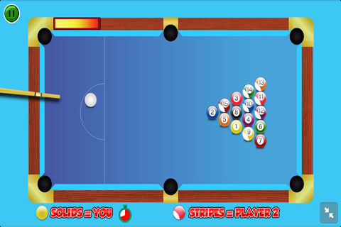 Fun and addictive Eight ball game. Pocket all your own balls (you will be playing the solid balls, while the other player will be playing the stripes) and then pocket the black ball as the last ball. Use your finger to tap and control the angle. Release and tap again to shoot.