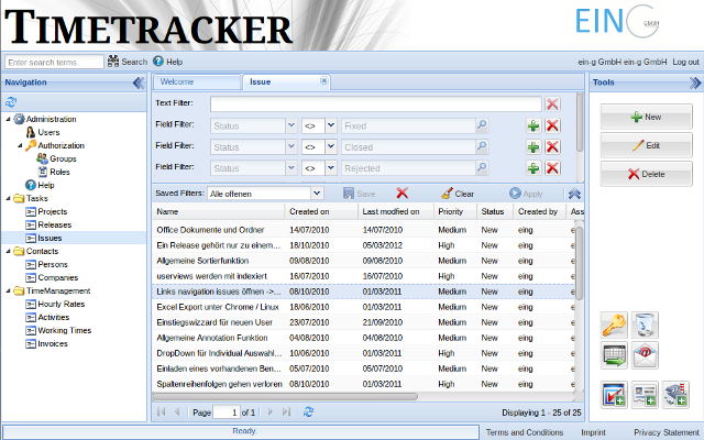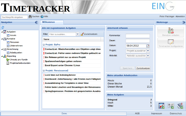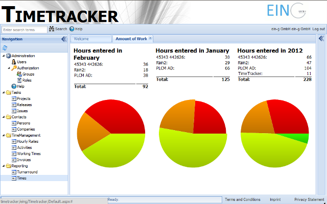 Free! No Risk! Online project, task and address management, time tracking, invoicing and team collaboration.TimeTracker helps you organize your everyday work. Free! No Risk! Online project, task and address management, time tracking, invoicing and team collaboration. TimeTracker helps you organize your everyday work. Start using TimeTracker today and see how easy managing your projects and working time could be. Features: Time Management: You and your team members enter your working time fast and easily. Project Management: Keep track of all your projects you are working on. Contacts: Share and manage your customer contacts with your team. Task Management: Assign your working tasks to team members, set priorities and just enjoy the knowledge that nothing gets lost anymore. Invoicing: No hassle with Excel Sheets or paper time sheets. Simply start up our invoice assistant and earn money. Search: Stop wasting time searching for the data in different locations and with reduced functionality. TimeTracker provides sophisicated searching over all the data you ever stored in it. Reporting: See how much time is spent on which project and the money earned with what customer. Permissions: Decide which team member has access to which data. TimeTracker lets you define granular permissions if you want or leave it open for everyone. No local Installation: Use TimeTracker from any browser on any desktop. No need to install local software. Just enter the right url and start working.
