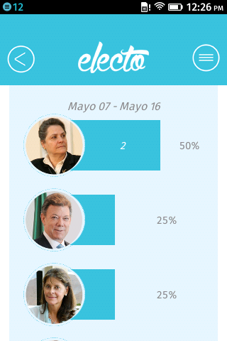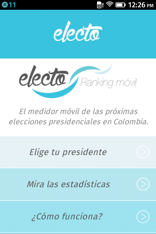 Electo es el medidor móvil para las próximas elecciones presidenciales en Colombia. Medimos en tiempo real las desiciones electorales de cada colombiano. El app refleja rápidamente como afectan las opiniones de cada candidato en los debates, las aspiraciones mediáticas o las opiniones públicas en la desición de voto del electorado. El método es el siguiente: Sólo se puede tener un voto por cada móvil, lo que significa que no puede haber fraude. Se podrá cambiar cuantas veces lo desee, pero núnca se podrá tener dos votos al mismo tiempo por un móvil. Electo llega a todos los teléfonos inteligentes, buscando un soporte real para todo tipo de público en las tres plataformas principales (Android, iOS, Firefox OS) Dentro de la plataforma se podrá acceder fácilmente a las campañas de cada candidato para informarse mejor antes de tomar esta importante desición.