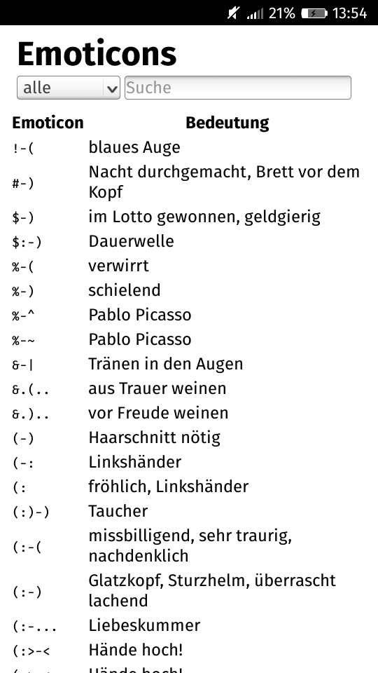 Installiere die aktuelle Version von GitHub! Die Version hier im Marketplace kann keine Aktualisierungen mehr erhalten! Einfaches Verzeichnis für Emoticons mit ihrer Bedeutung, einschließlich Suchfunktion Wünsche zu Emoticons, die ich neu in die Liste aufnehmen soll, können mir gerne per E-Mail zugesandt werden, aber bitte immer mit ein paar Quellen, die die tatsächliche Verwendung belegen.