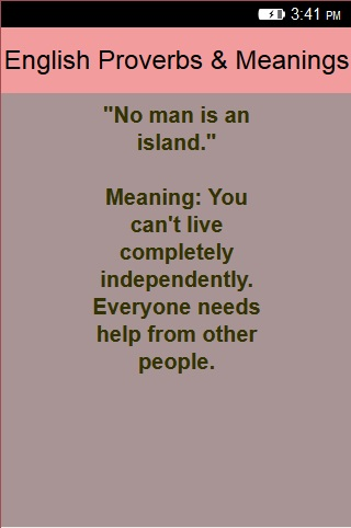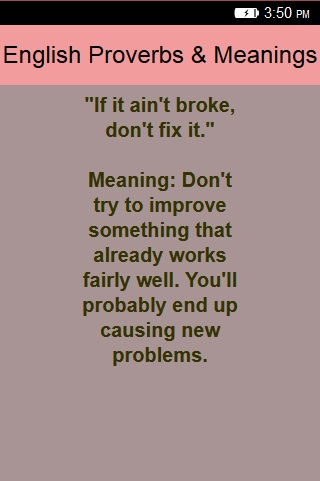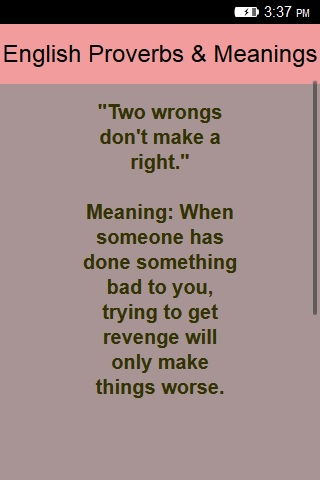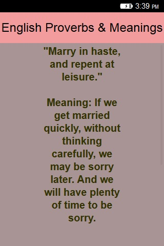 Here comes the exclusive English Proverbs and its Meanings. Check out... ✪In this we have come up with the most famous and interesting "English Proverbs" and its "Meanings." ✪There are about 100 English Proverbs and its Meanings in this App. ✪ English Proverbs are those which are simple and concrete sayings, popularly known and repeated, that expresses a truth based on common sense or the practical experience of humanity. ✪These are the ultimate Direction of life. ✪ This is totally a FREE APP. # If you like any proverb and its meaning from this app you can simply tap on the text and you will get share options then you can share with your friends or even email it.