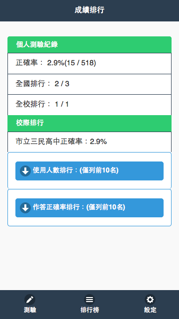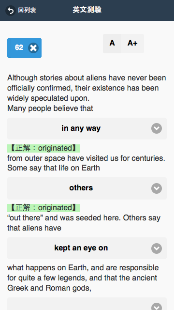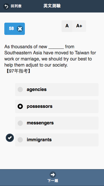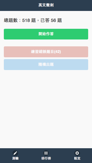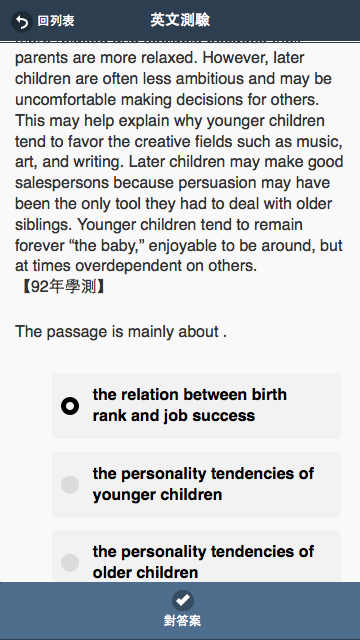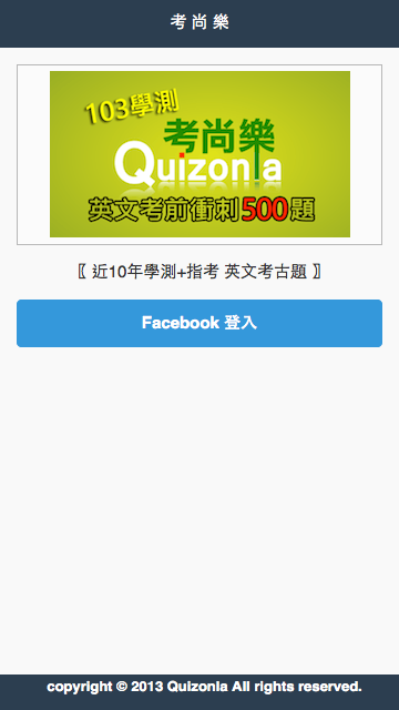 App主要功能: 精選近年來500題英文學測指考歷屆試題(詞彙、綜合測驗、文意選填及閱讀測驗) 主要以關卡制讓使用者可以先練習考古題,完成後再將答錯題目反覆練習至瞭解為止 英文考前2週作戰計畫,三階段關卡 ★ 歷屆考題500題 ★ 答錯題目練習 ★ 隨機出題練習 學測考試在即,多數的考生反應 英文科需要反覆練習才容易養成習慣 且歷屆考古題是最後衝刺必備的準備 此外,時事題的涉獵則會讓考試事半功倍 更重要的是,上考場時答題時間分配也是決定是否高分的關鍵 如何將詞彙、綜合測驗、文意選填及閱讀測驗快速且正確地完成 以利後續的中譯英與作文,將會決定英文這科拿高分的重點!! 因此,考尚樂團隊因應眾多考生回應 在近半個月的時間內開發一套91~102年英文學測指考例屆考題的複習App(目前非常雛型) 免費提供辛苦的考生使用,讓你在通勤的時間,或是課餘之時 能夠隨時練習歷屆考題,並針對錯誤題型再次練習 各位同學辛苦了,若覺得這個App不錯 再請給予我們一些建議與指教 讓這個App能夠愈來愈好,謝謝!