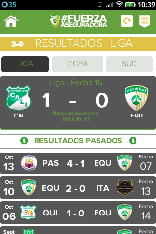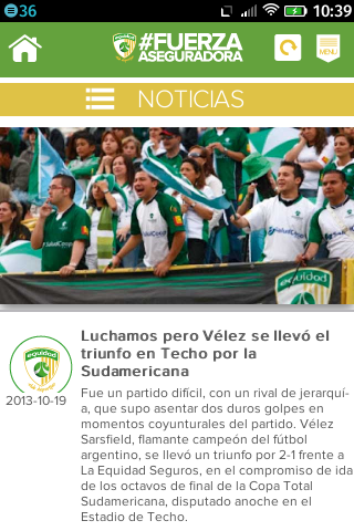 Aplicación del cuadro asegurador del fútbol colombiano ¡Creada por hinchas para hinchas! Esta versión de la aplicación de la Equidad, te permitirá encontrar de manera rápida, ágil y sin rodeos, toda la información que necesitas saber del conjunto asegurador Comparte a través de tus redes sociales, el orgullo de ser hincha del sorprendente tercer equipo de la capital, utilizando la etiqueta #FuerzaAseguradora En esta aplicación podrás encontrar: • Noticias cortas y concretas sobre el presente del club • Resultados actualizados en tiempo real. • Estadísticas y tablas de posiciones de todos los torneos en los que el club se encuentra participando. • Calendarios con la información actualizada sobre los partidos que el club esté por enfrentar, en todos los torneos en los que se encuentre participando. • Información minuto a minuto de los partidos del club, con actualizaciones sobre todo lo que va aconteciendo en el campo, ¡EN TIEMPO REAL! • Información actualizada sobre el plantel profesional del club (posición, lugar y fecha de nacimiento, estatura, peso, etc). ¡Conoce y ten a la mano la lista de jugadores e ídolos que lo hacen grande! • Acceso directo a las redes sociales oficiales del club, donde podrás interactuar con otros hinchas como tu.