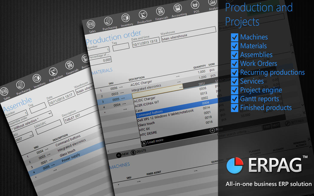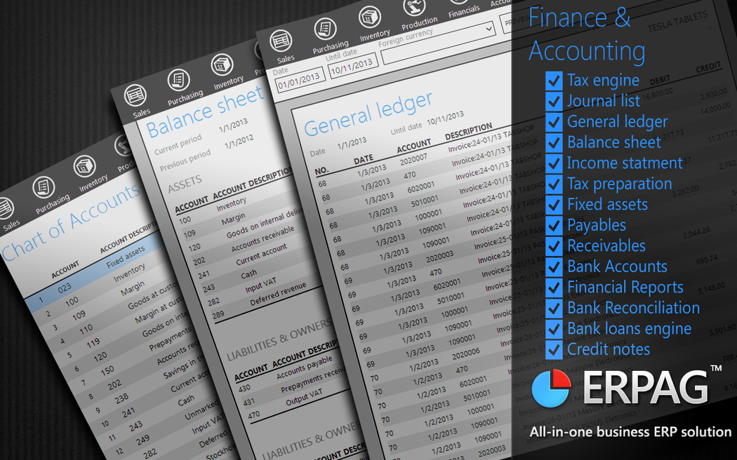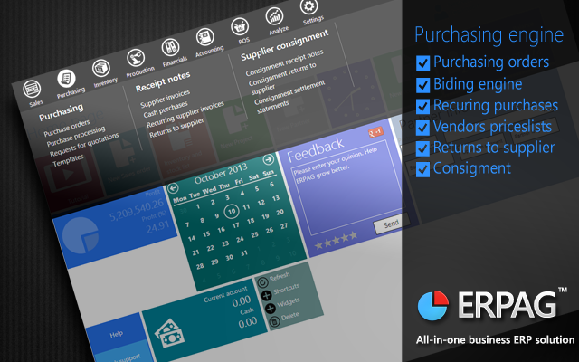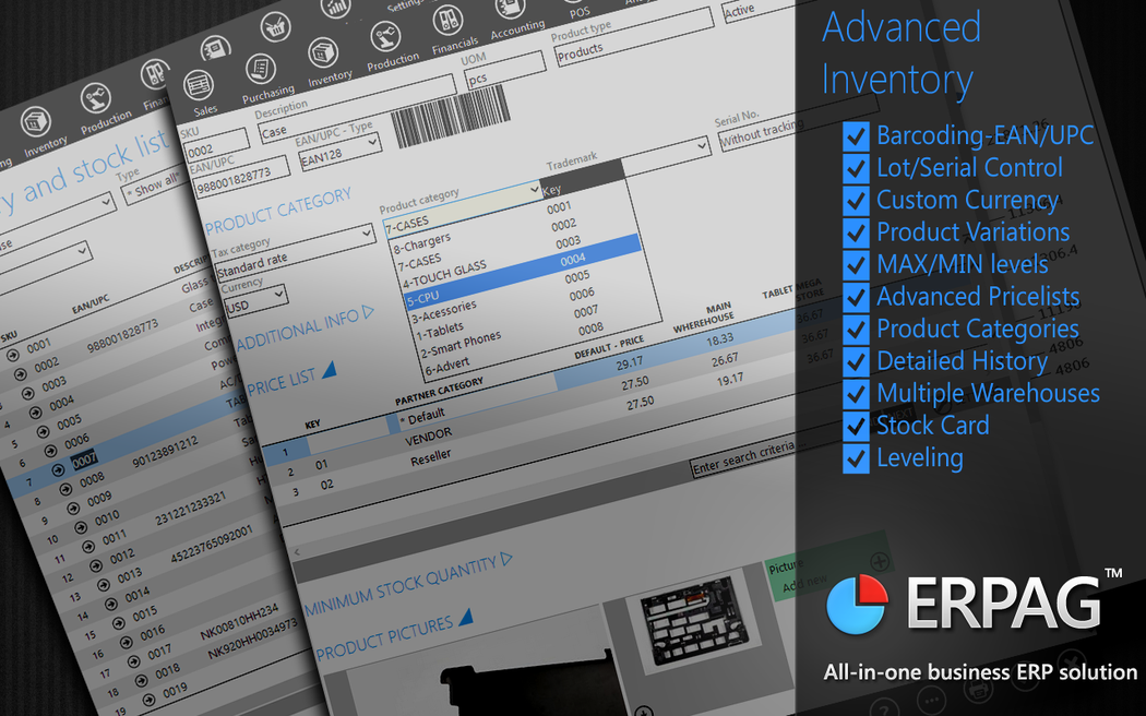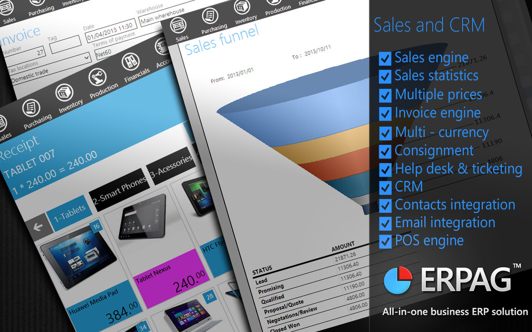 ERPAG is a ERP cloud service that covers all business processes for small or mid-sized companies. ERPAG is a ERP cloud service that covers all business processes for small or mid-sized companies. ERPAG GLOBAL FEATURES ▪Desktop look-and-feel like ▪INGRID searches –fast entry ▪Backup management ▪Role oriented ▪Comprehensive app ▪Encrypted communication ▪Integrated support Save to cloud ▪Export (.doc, .xls, .pdf, send as email) SALES AND CRM ▪Complete sales management ▪Pre-sales processing ▪One click converting process (Lead-Opportunity -Quotation-Invoice-Payment-Delivery) ▪Complete customer insights (widgets: revenue, top aged, best customers , etc.) ▪Ticketing and troubleshooting engine ▪Campaigns ▪Sales dashboards provide accurate widget based, real-time full drill-down capabilities. ▪Currency management provides engine for automatic currency conversion ▪Tax Engine for managing multiple tax types ▪Different payment terms ▪Customizable notes ▪Recurring invoices ▪Customer Returns PURCHASING AND SUPPLIER MANAGEMENT ▪Accumulating different purchase order types in one purchase processing engine ▪Complete purchase flow management (RFQ-Purchase Order-SupplierInvoice-Payment) ▪Manual and automatic purchase management using predefined setups and rules ▪Different payment types ▪Recurring supplier invoices ▪Importing supplier invoices ▪Supplier returns ▪Consignment management ▪Different payment terms PRODUCTION ▪Multi-level assemblies ▪Project management with Gantt chart ▪BOM based production ▪Recurring production ▪Time managed production ▪One click assembly ▪Services WAREHOUSE AND INVENTORY CONTROL ▪Real-time, detailed visibility into key inventory control ▪Slash inventory costs by tightening control of stock levels while increasing operational efficiencies ▪Different types of pricing-pricelist management ▪Auto-generated stock –taking list for a faster inventory control ▪Product-card with product change history ▪Direct document linking ▪Detailed product definitions (Images, SKU, barcode, manual linking, categories, trademarks etc. ) ▪Internal deliveries ▪Multiple-warehouses FINANCE AND ACCOUNTING ▪Payables and receivables, with real-time access to outstanding invoices and supplier invoices. ▪Fixed Asset Management ▪Financial Dashboards, Reporting and Analytics ▪Monitor and manage financial performance of your business, using real-time dashboards with key revenues, expenses and more ▪More than 100 standard reports ▪Easily create and define financial reports according to the needs of your business using BI engine. ▪Payment Management ▪Direct document linking (invoice, supplier invoice, campaign, project ) ▪Advance payments-Prepayments ▪Credit and interest engine POINT OF SALE ▪Back-office management ▪Different types of payment ▪Different sales regimes ( ) ▪Printing support ▪Discounts ▪Customer Returns ▪Barcode integration ▪BI and standard reports BUSINESS INTELLIGENCE ▪Better decision making ▪Graphic engine ▪Export to different document types(.doc, .xls, .pdf ) ▪Send emails ▪Pin reports as shortcuts to dashboard ▪Individualized – role based reporting—in real-time. --------------------------------------------------------- By ‘’all’’ we mean: Purchasing, Sales, Production, Stocks, Project planning, POS, Payroll, Business Analysis. But, how can such a complex solution function in your company, without hiring an army of experts? Well, this is not exactly a complex solution. Using a simple interface we have achieved to cover very complex processes, to adjust them to You, without losing functions- such as automatic booking, linking documents, etc. Our goal was to make a simple ERP software that covers complex processes. But how? In the process of developing and testing ERPAG that answer arose, therefore we established fundamental principles that are like DNA of ERPAG Simplicity Without complicated forms, hidden options, complex manuals. Natural copying of real business processes into application enables users intuitive using. Automatisation Not only typical automatic bookings! But accumulating experiences in the process of working, because ERPAG is alive service that learns and calculates, it can memorize your settings and use them in daily work. Erpag reminds you of your obligations, whether you have payments, deliveries, tasks, or important dates. Integration Erpag is a simple inetgrated solutution for your Company. One-time input is implied! Integration enables that once entered change is visible in all business processes, which further means that below the hood there is one unbelievable engine that enables processing, storing, prepartion for reporting, with only one single click. All modern and expensive information technologies are offered in ERPAG- we have included: index search, transactional bases, analyist- datawarehouse bases, notifications, online service connectivity, back- up process, into one powerful engine that maximally saves service resources, which enables us to offer cuttingedge techologies based on very competitive prices. Morphing- User wrapping ERPAG recognizes User's needs. By choosing “Roles“ in ERPAG you are creating types of users that will use ERPAG within your organization. Every user has their commitments and daily routines, so it is fully possible to adjust ERPAG according to the needs of employees, and by doing that, the time of implementation is reduced for almost 90% and your employees are much more productive. Documents, reports, statistics, notifications- everything can be adjsuted to a concrete work postion of users, by which productivity is drastically increased. All application elements could be profiled according to users' needs, thus we like to say that: ERPAG WRAPS AROUND USERS. Availiability Yes, it is possible, on all platforms, but when we say availability, we don't think only hardware and software, but 
