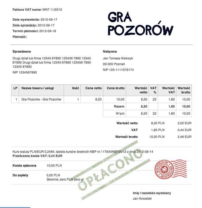 - Wielojęzyczność - faktury można wystawiać w języku polskim, angielskim, niemieckim, hiszpańskim, francuskim, włoskim, czeskim i rosyjskim. Dostępne są też faktury wielojęzyczne,