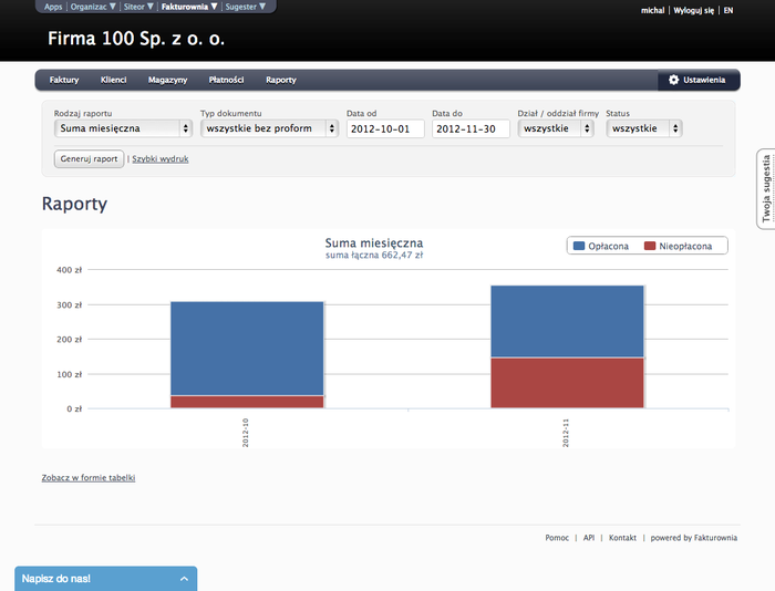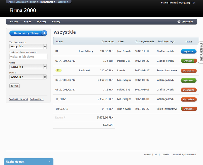 Prosty w obsłudze program do wystawiania faktur, rachunków i paragonów, który zaoszczędzi Twój czas. Od teraz fakturowanie może być szybkie i przyjemne. Fakturownia.pl to jedna z najprostszych na polskim rynku aplikacji do wystawiania faktur i rachunków. Za jej pomocą już w pół minuty można wystawić fakturę i wysłać ją do klienta wprost z systemu. Funkcjonalność programu została szczegółowo przemyślana i daje firmom wiele możliwości. Zapewnia zarówno najprostszy interfejs do wystawiania faktur, jak i pełną obsługę magazynową. Faktury, paragony, korekty, zaliczki, proformy, zamówienia, faktury walutowe – to tylko część dokumentów, które można wygenerować za jej pośrednictwem. Faktura może być też sporządzona we wszystkich walutach, a system automatycznie przeliczy jej wartość według kursu NBP. Z Fakturowni może korzystać każdy przedsiębiorca, niezależnie od rozmiarów prowadzonego biznesu. Jej wielką zaletą jest bardzo przejrzysty i prosty sposób porządkowania dokumentów i nadawania im określonych statusów (wysłane, opłacone, zaległe). Na uwagę zasługuje także fakt, że program Fakturownia może być połączony z systemami płatności automatycznych, takimi jak: PayU, PayPal, dotPay, czy przelewy24, co ułatwia współpracę biznesową. Dodatkowo każdy użytkownik ma wpływ na funkcjonalność programu poprzez możliwość zgłaszania swoich uwag i wskazówek poprzez zakładkę Pomoc dostepną ze strony głównej serwisu, kierującą do interaktywnej Bazy Wiedzy i Sugestii. Co można zyskać: