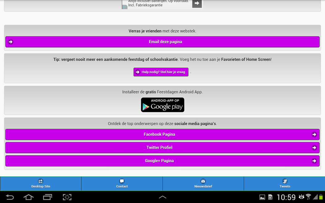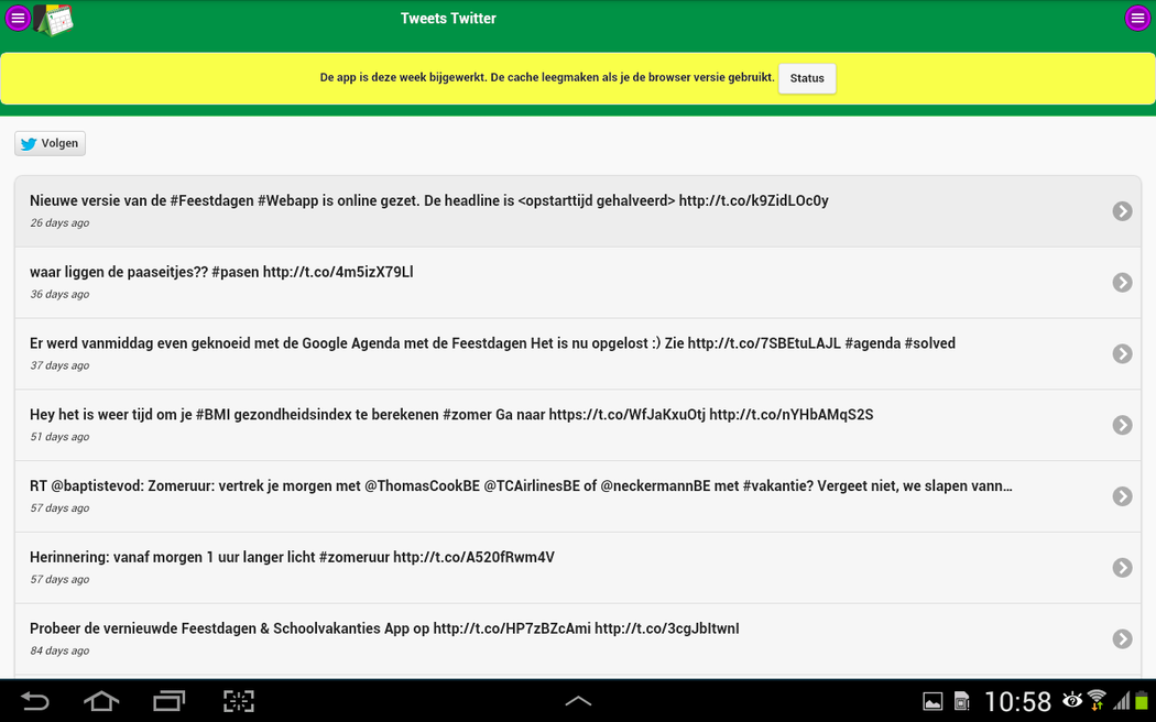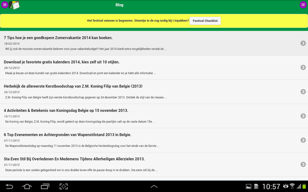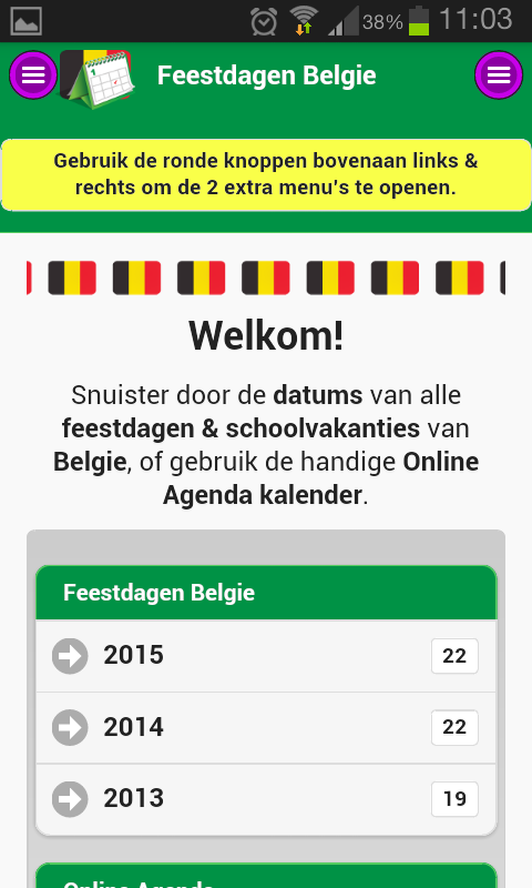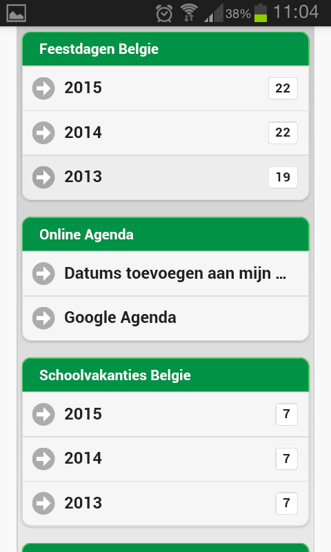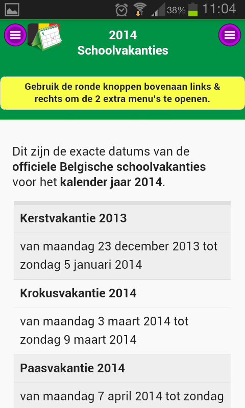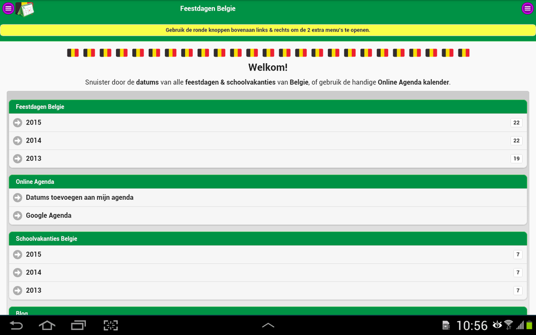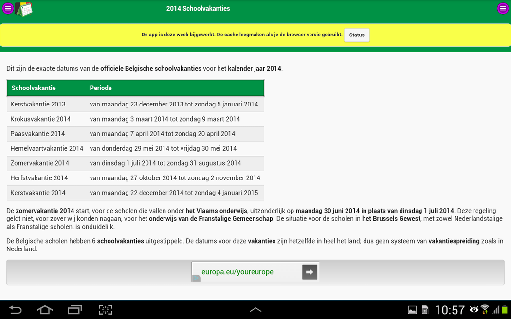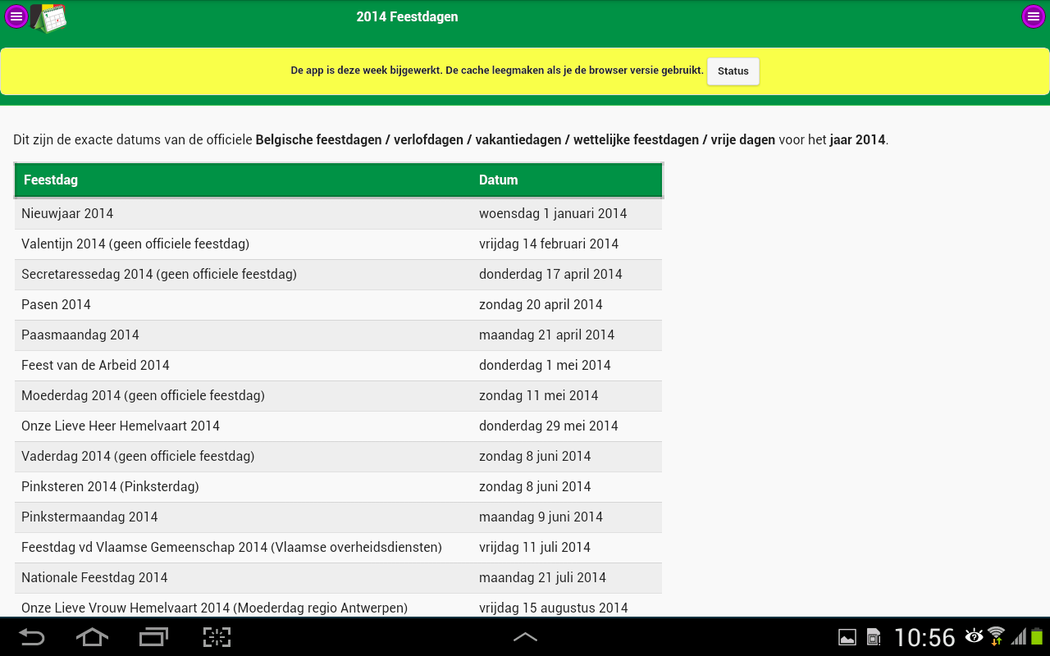 Discover the exact dates of the Belgian national holidays and school holidays. ** This app also provides actual news, interesting holiday tips and year calendars. Nothing more but also nothing less. ** A free public Google Agenda that you can also use on your smartphone or tablet. ** Receive a reminder email for an upcoming Belgian national holiday or school holiday. ** Seamless Integration of these dates in your electronic agenda. ** Download free year calenders in PDF file format. ** The dates is also available in free Google Docs, Microsoft Excel en Microsoft Word documents. De full-desktop browser version is available at School vacations and Public holidays of Belgium.