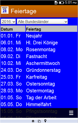 Diese Anwendung berechnet bundeslandabhängige Feiertage für Deutschland auf Basis von Firefox OS