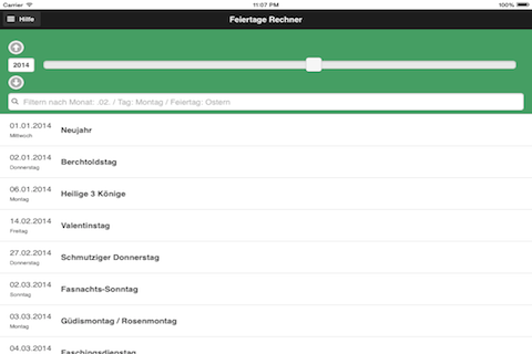 Feiertage Rechner bis 2099 Mit dieser App kannst du die wichtigsten Feier- und Fest-Tage zwischen den Jahren 1900 bis 2099 bestimmen. Hier ein Ausschnitt aus den Feiertagen: Neujahr Berchtoldstag Heilige 3 Könige Valentinstag Schmutziger Donnerstag Fasnachts-Sonntag Güdismontag / Rosenmontag Faschingsdienstag Aschermittwoch 1. Fastensonntag Morgestraich Basler Fasnacht Palmsonntag Gründonnerstag Karfreitag Ostern Ostermontag Tag der Arbeit Muttertag Auffahrt / Christi Himmelfahrt Pfingstsonntag Pfingstmontag Fronleichnam Nationalfeiertag CH Mariä Himmelfahrt Buss- und Bettag Knabenschiessen (ZH) Halloween Allerheiligen Zibelimaerit (BE) Erster Advent Mariä Empfängnis Heiligabend Weihnachten Stephanstag Silvester Die christlichen Feiertage basieren fast ausschliesslich auf dem Osterdatum. Daraus lassen sich alle wichtigen Feiertage errechnen.
