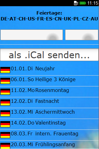 Feiertage und Gedenktage aus 11 Ländern. Alle Daten können Sie als .iCal Datei per eMail an sich selbst senden und damit in den Kalender des Gerätes übertragen. Anleitung enthalten. Feiertage von: • Deutschland, Schweiz, Österreich, USA, Frankreich, Spanien, Kanada, Großbritannien, Polen, Tschechien, Australien • Alle Feiertage werden mathematisch berechnet • Auswahl von Land und Jahr • 30 Jahre zur Auswahl: aktuelles Jahr +30 • Theoretisch bis zum Jahr 9999 möglich • senden als .iCal Datei per eMail iCal: • Programm > Feiertage > iCal-Datei > eMail • PC oder Mac > eMail > Datei aud der eMail speichern • Hinzufügen zum Google-, Outlook-, Mac- und andere Kalender • Die Daten sind nun im Kalender des Gerätes.