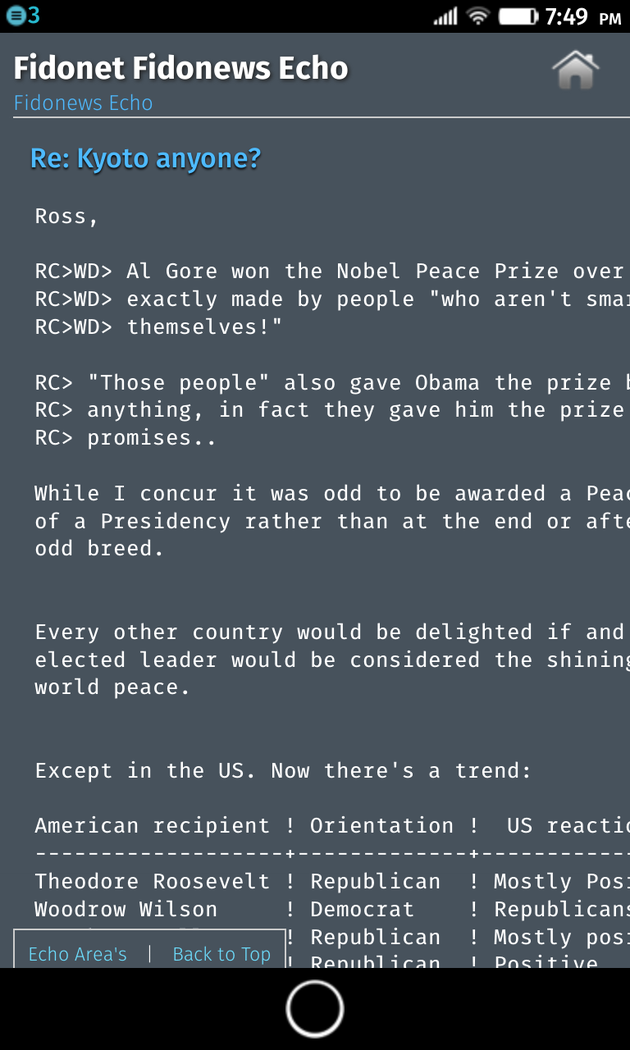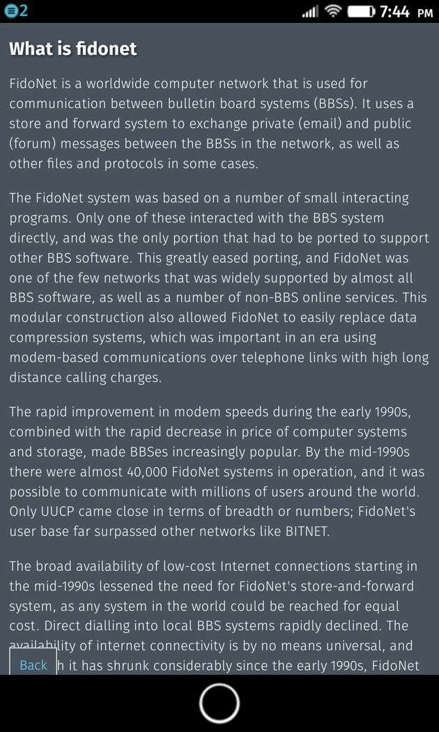 Fidonet RSS Reader! What is Fidonet: FidoNet is a worldwide computer network that is used for communication between bulletin board systems (BBSs). It uses a store and forward system to exchange private (email) and public (forum) messages between the BBSs in the network, as well as other files and protocols in some cases. The FidoNet system was based on a number of small interacting programs. Only one of these interacted with the BBS system directly, and was the only portion that had to be ported to support other BBS software. This greatly eased porting, and FidoNet was one of the few networks that was widely supported by almost all BBS software, as well as a number of non-BBS online services. This modular construction also allowed FidoNet to easily replace data compression systems, which was important in an era using modem-based communications over telephone links with high long distance calling charges. The rapid improvement in modem speeds during the early 1990s, combined with the rapid decrease in price of computer systems and storage, made BBSes increasingly popular. By the mid-1990s there were almost 40,000 FidoNet systems in operation, and it was possible to communicate with millions of users around the world. Only UUCP came close in terms of breadth or numbers; FidoNet's user base far surpassed other networks like BITNET. The broad availability of low-cost Internet connections starting in the mid-1990s lessened the need for FidoNet's store-and-forward system, as any system in the world could be reached for equal cost. Direct dialling into local BBS systems rapidly declined. The availability of internet connectivity is by no means universal, and although it has shrunk considerably since the early 1990s, FidoNet remains in use around the world.