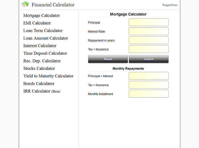 Financial Calculators: Mortgage, EMI, Loan Term, Loan Amount, Interest, Time Deposit, Rec. Dep., Stocks etc. Financial Calculators: Mortgage Calculator EMI Calculator Loan Term Calculator Loan Amount Calculator Interest Calculator Time Deposit Calculator Recurring Deposit Calculator Stocks Calculator Yield to Maturity Calculator Bonds Calculator IRR Calculator